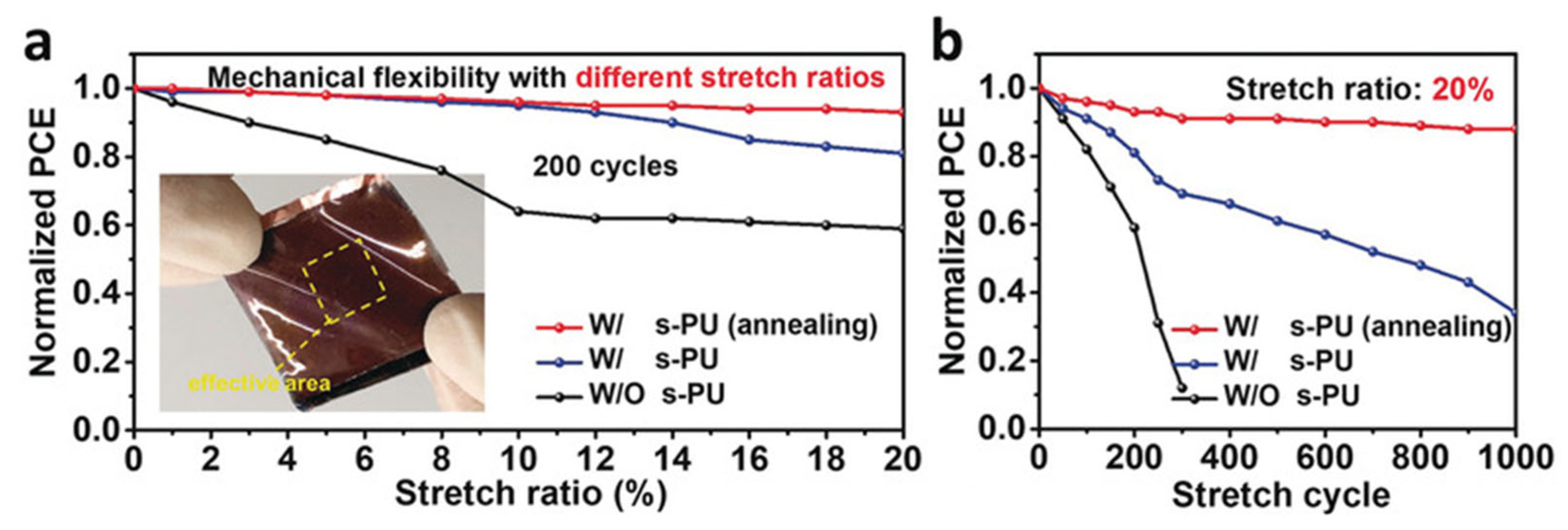 | Flexible PSCs | Mechanical bending fatigue, crack initiation/propagation, interfacial delamination | Elastomeric polymers, hydrogen-bonding systems (fast recovery), dynamic covalent networks with high elasticity, PU-based systems |