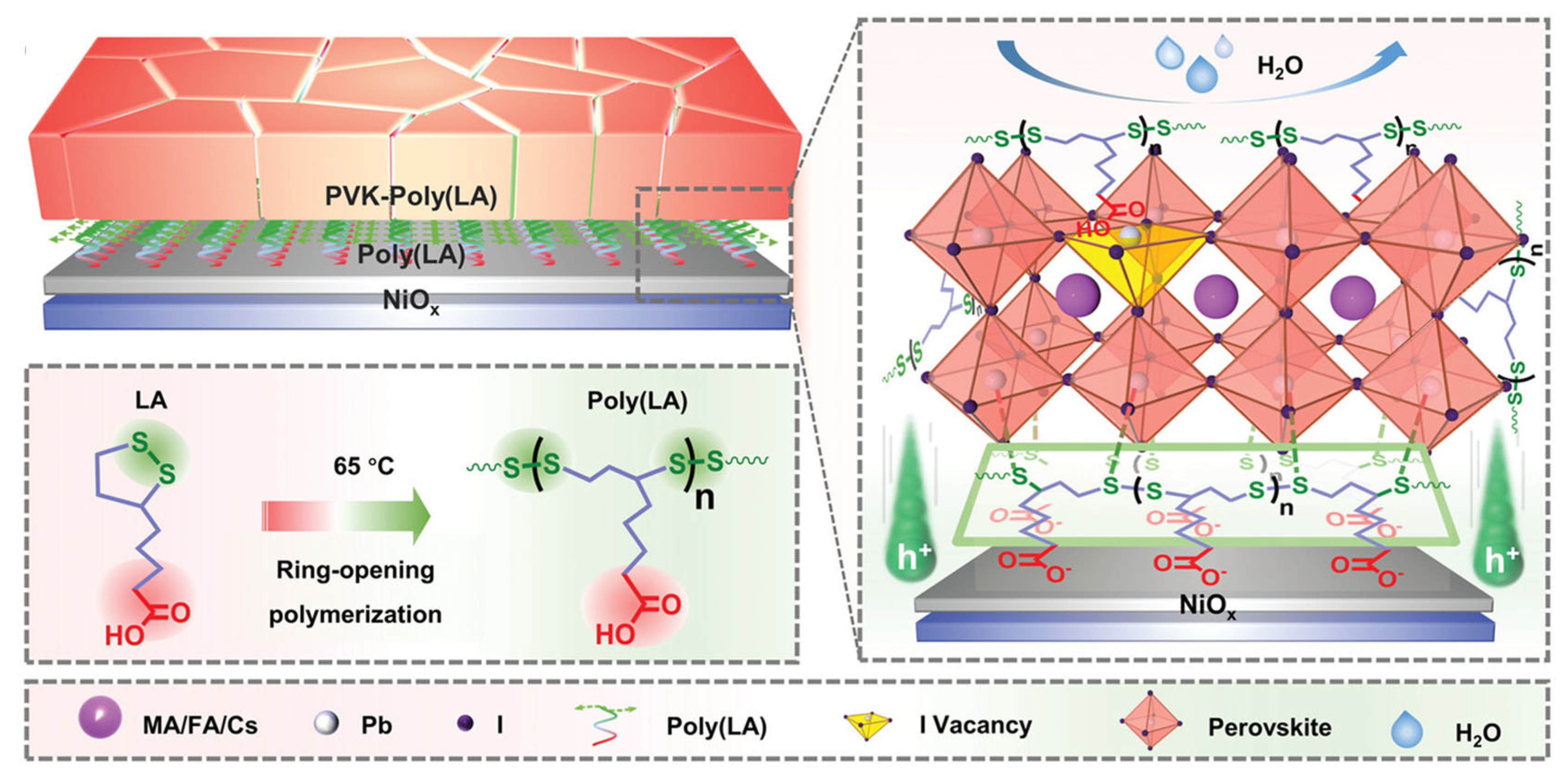 - Li, Z.; Sun, A.; Tian, C.; Zhuang, R.; Zheng, Y.; Wu, X.; Ouyang, B.; Du, J.; Cai, J.; Chen, J.; et al. Sustainable molecular passivation via heat-induced disaggregation and redox reactions for inverted perovskite solar cells. ACS Energy Lett. 2024, 9, 5471–5482. [Google Scholar] [CrossRef]
