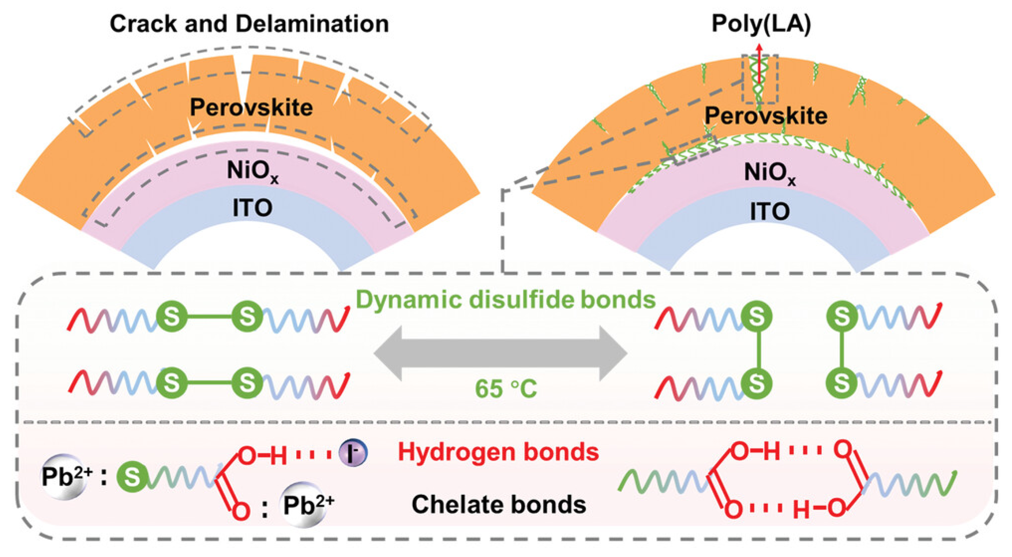| Rigid PSCs | Moisture-induced degradation, phase instability, grain-boundary expansion, and mechanical microcracks from thermal cycling | Hydrophobic polymers, disulfide bond systems (long-term healing), crosslinked networks, passivation-oriented polymers (amine/carbonyl coordination) |