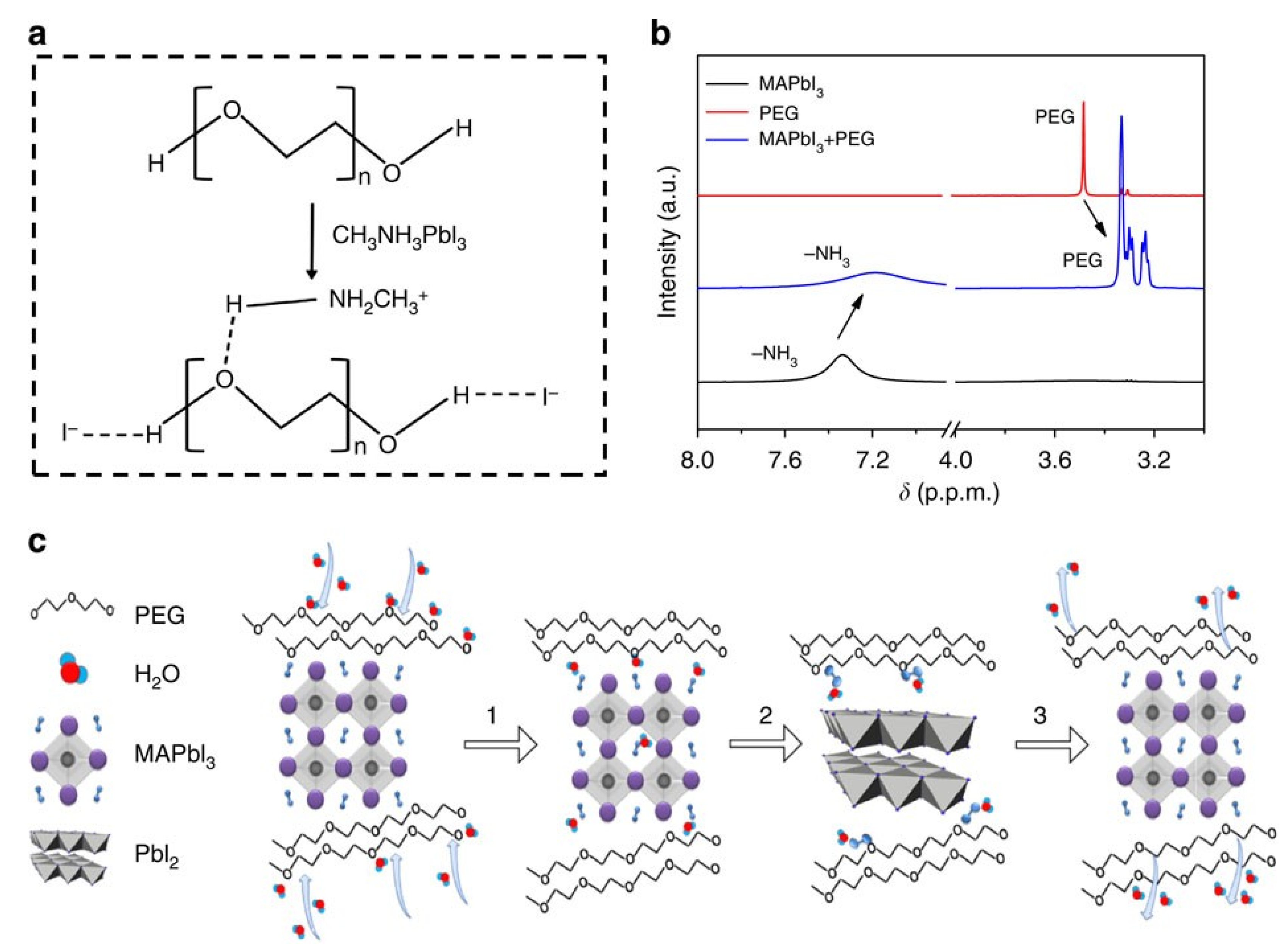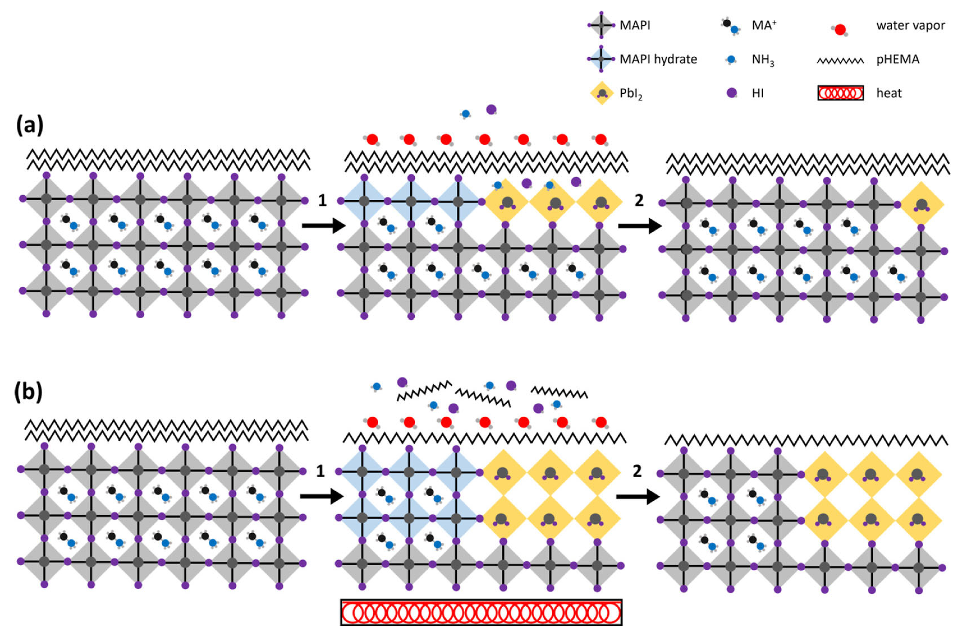 - Nam, J.-S.; Choi, J.-M.; Lee, J.W.; Han, J.; Jeon, I.; Kim, H.D. Decoding polymeric additive-driven self-healing processes in perovskite solar cells from chemical and physical bonding perspectives. Adv. Energy Mater. 2024, 14, 2304062. [Google Scholar] [CrossRef]
