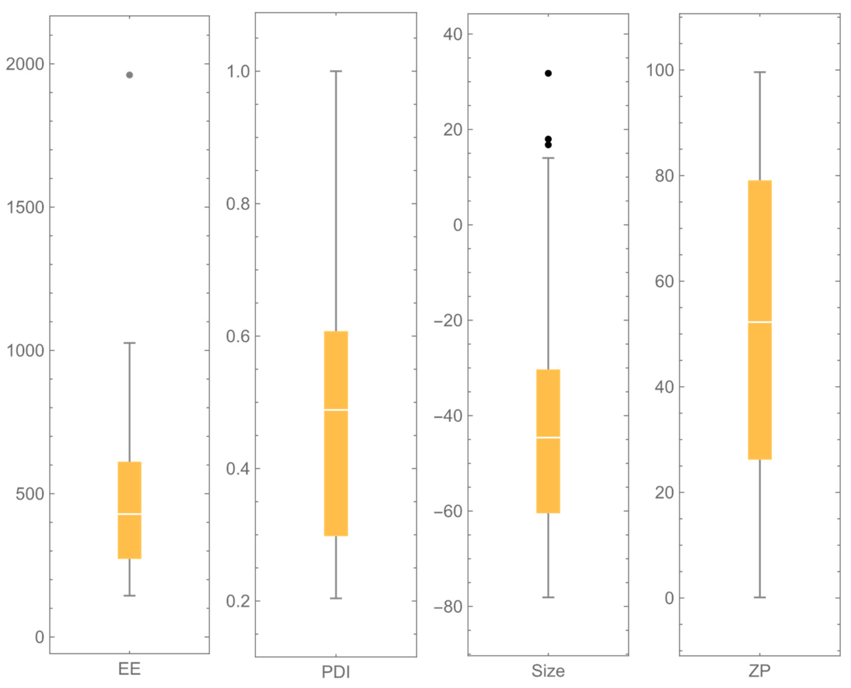 | PDI (0–1) | ZP (mV) | EE% (%) | PDI (0–1) | ZP (mV) | EE% (%) | ||
