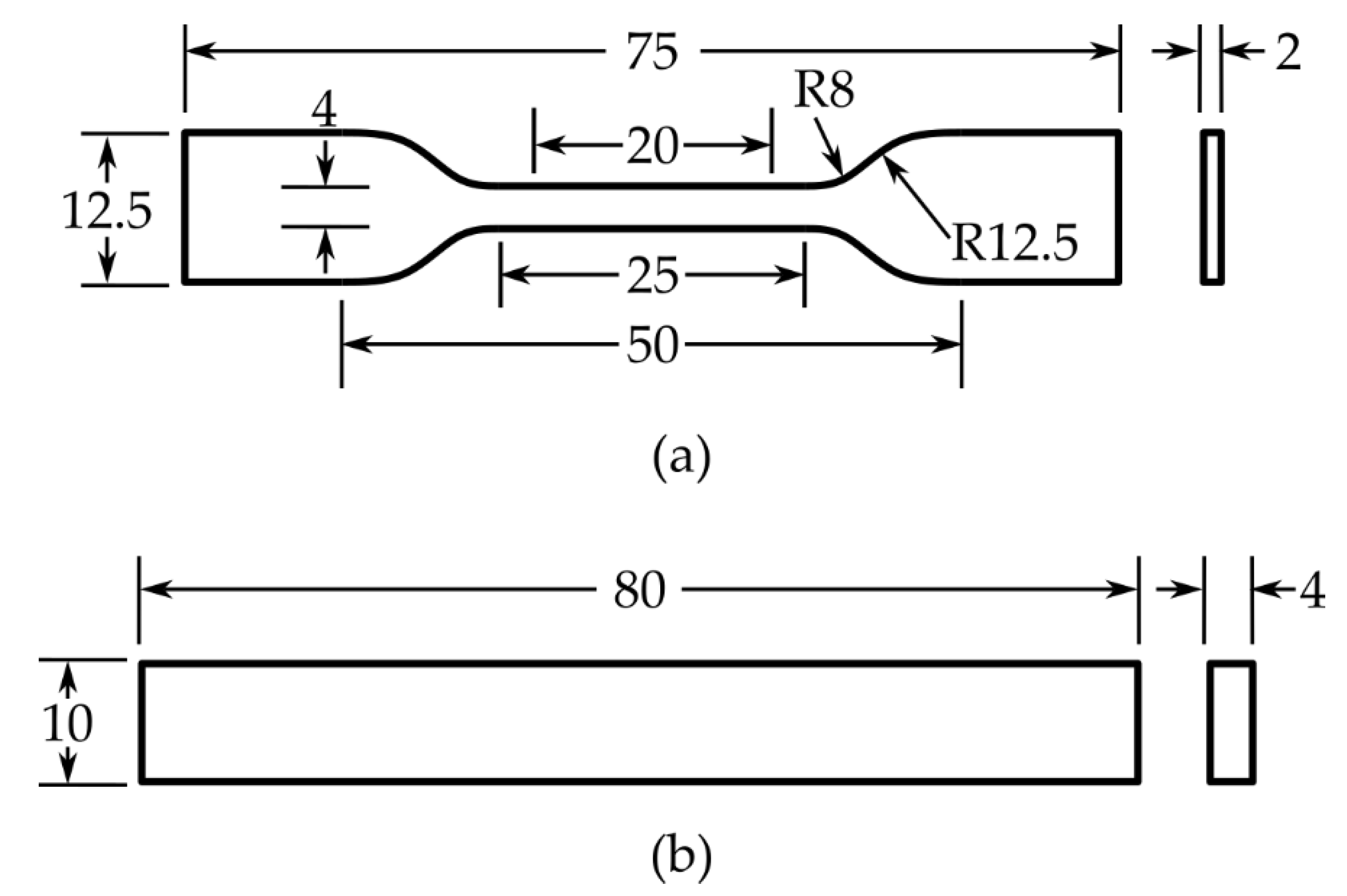 Figure 2a: gauge length of 20 mm, gauge width of 4 mm, overall length of 75 mm, and thickness of approximately 2 mm. Before testing, the specimens were conditioned at 23 ± 1 °C and 40 ± 5% relative humidity for at least 24 h to ensure equilibrium moisture content and consistent test conditions.