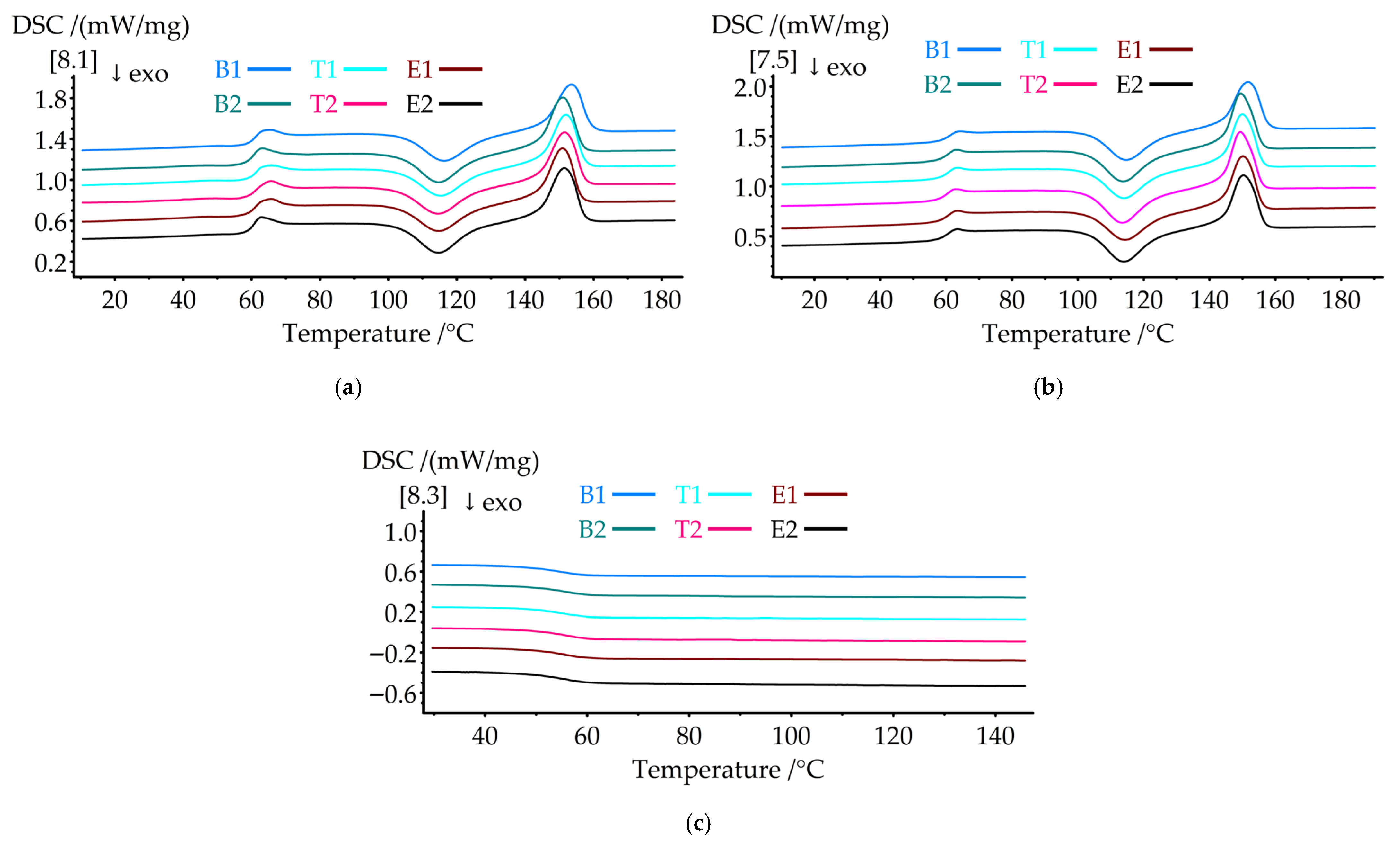 Figure 6 presents the DSC thermograms of the (a) first heating, (b) second heating, and (c) cooling cycles.
