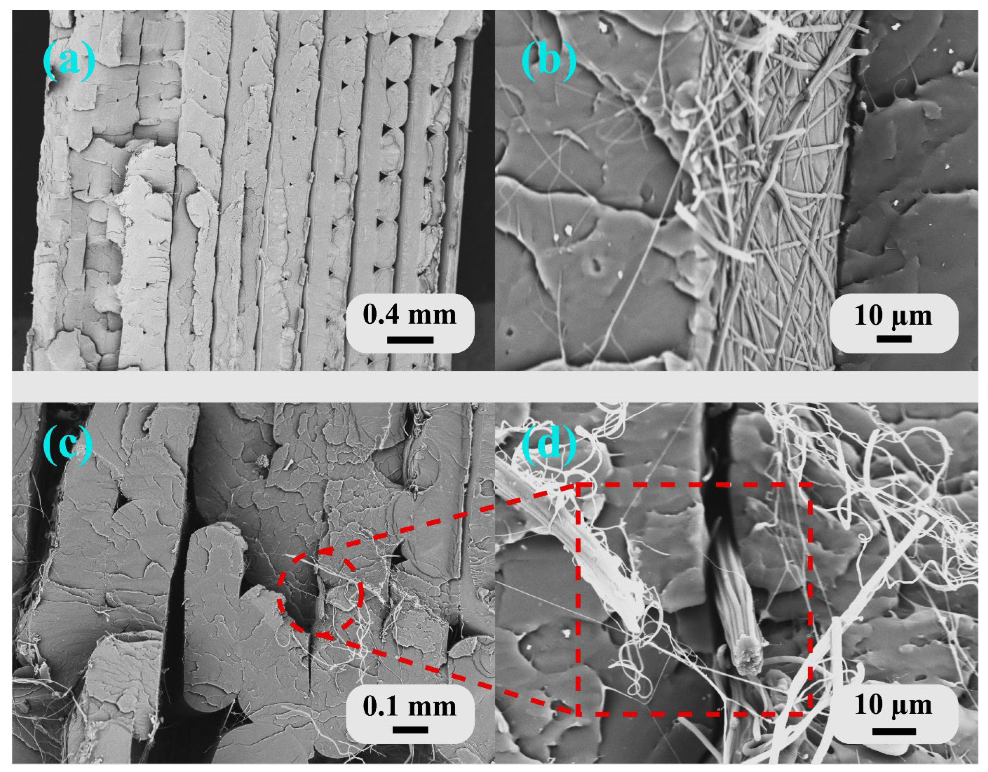 Figure 7c,d). The fracture surface showed significant nanofiber bundling and agglomeration between the extrusion lines. At 230 °C, the low-viscosity molten PLA dragged and displaced the electrospun nanofibers during deposition, creating fiber-rich bundles in the gaps between adjacent extrusion beads rather than uniform infiltration. These fiber bundles acted as stress concentrators and weak points, which explained the 19.2% reduction in tensile strength compared to B1. The disrupted nanofiber network was unable to effectively transfer loads, and the bundled regions likely acted as the initiation sites for premature failure.