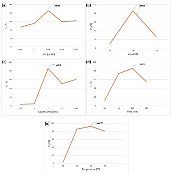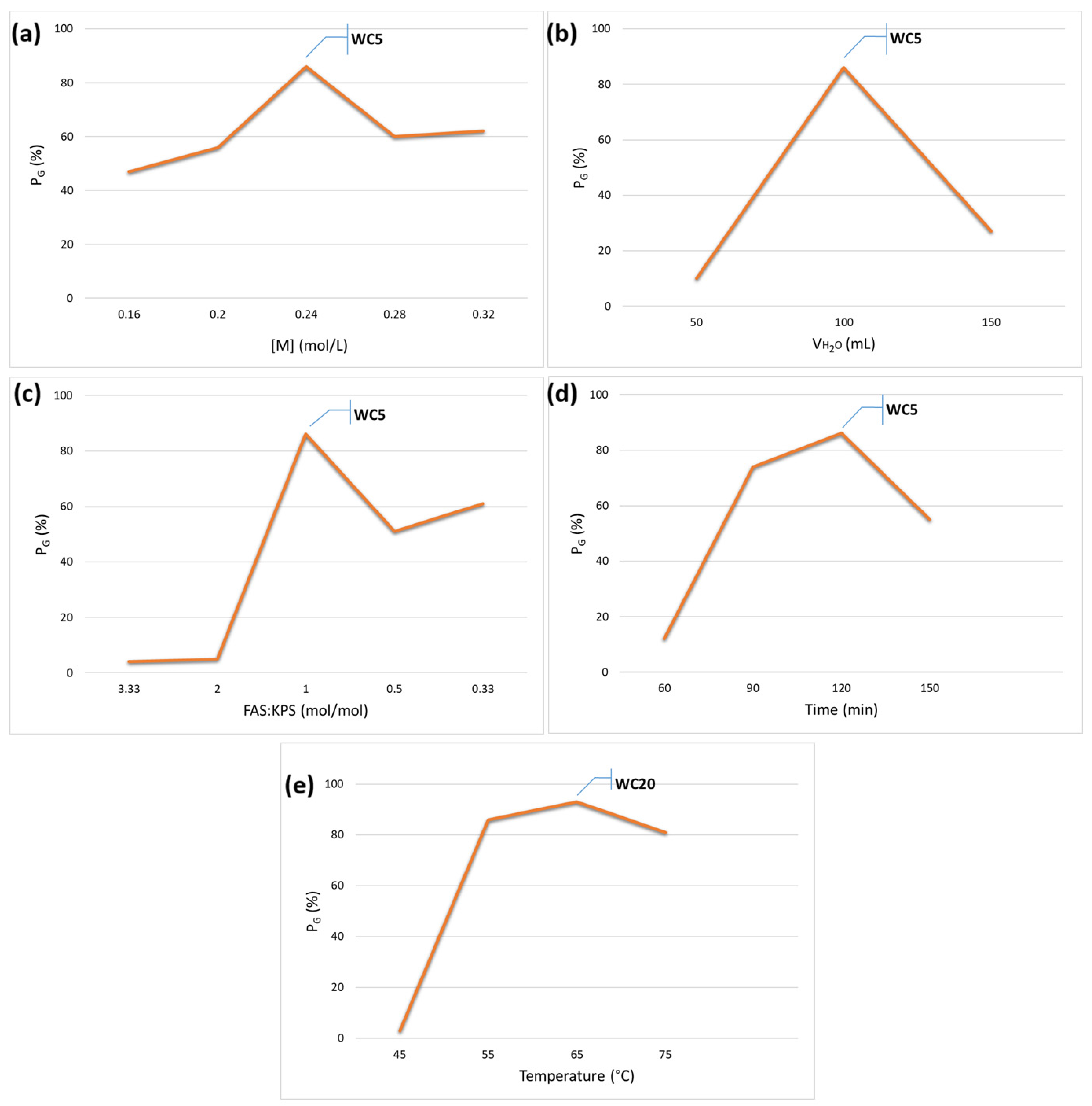 | Entry a | Product | Monomer (mol/L) | Solvent (mL) | FAS/KPS (mol:mol) | Time (min) | T (°C) | PG (%) |