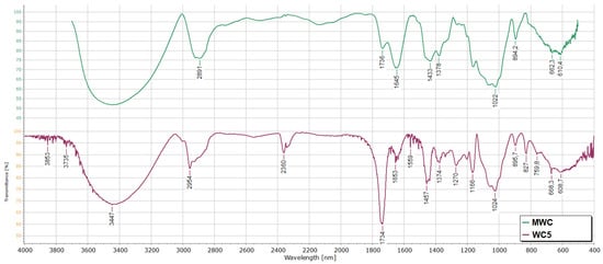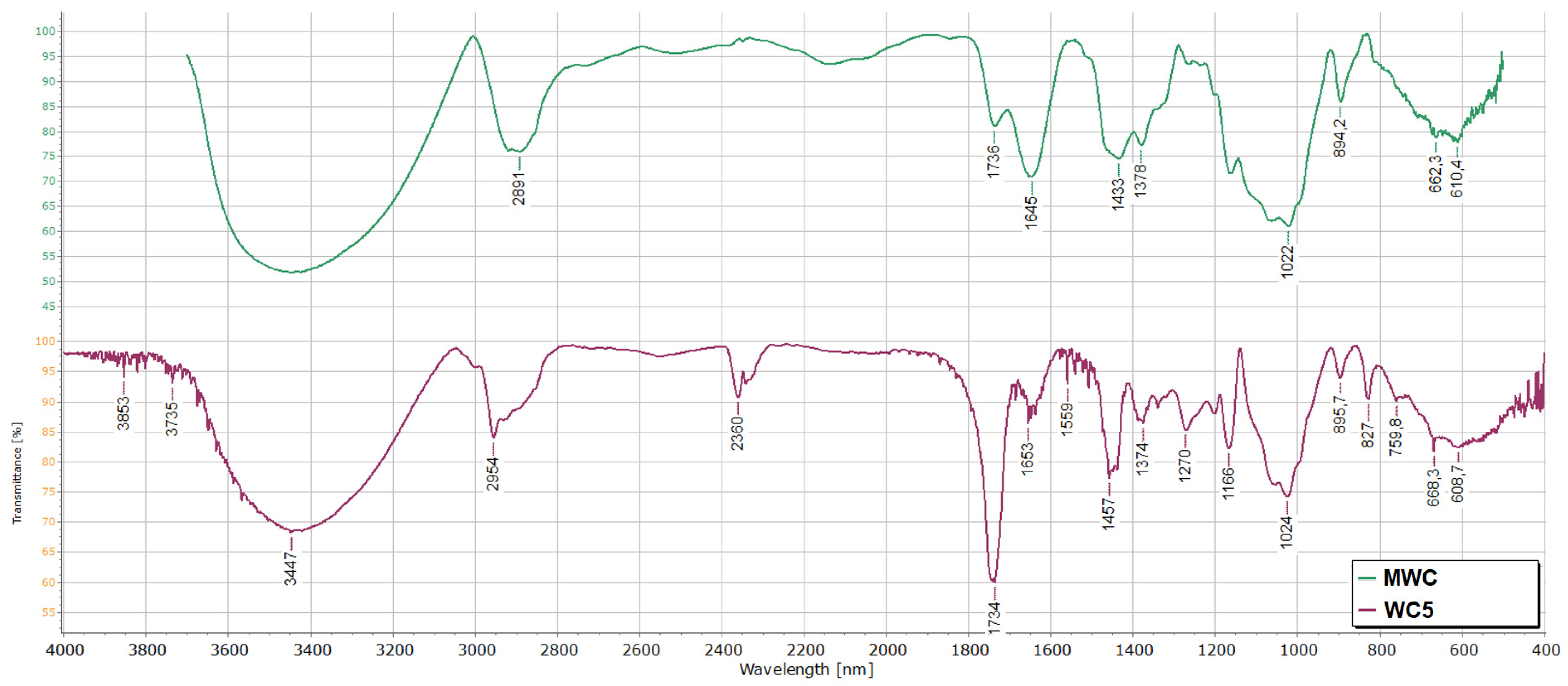 - The enhanced peak intensity near 894 cm−1, in the spectrum of MWC, indicates an increased amorphous content [42], resulting in greater hydroxyl group accessibility. Consequently, the mercerized fiber exhibits higher reactivity than the untreated cellulose, as grafting does not occur on the raw fiber. Furthermore, the peak at 1740 cm−1 is less intense than the native cellulose, suggesting that the pretreatment with NaOH solution helped to remove the hemicellulose components (see Figure S2 in the Supplementary Materials).