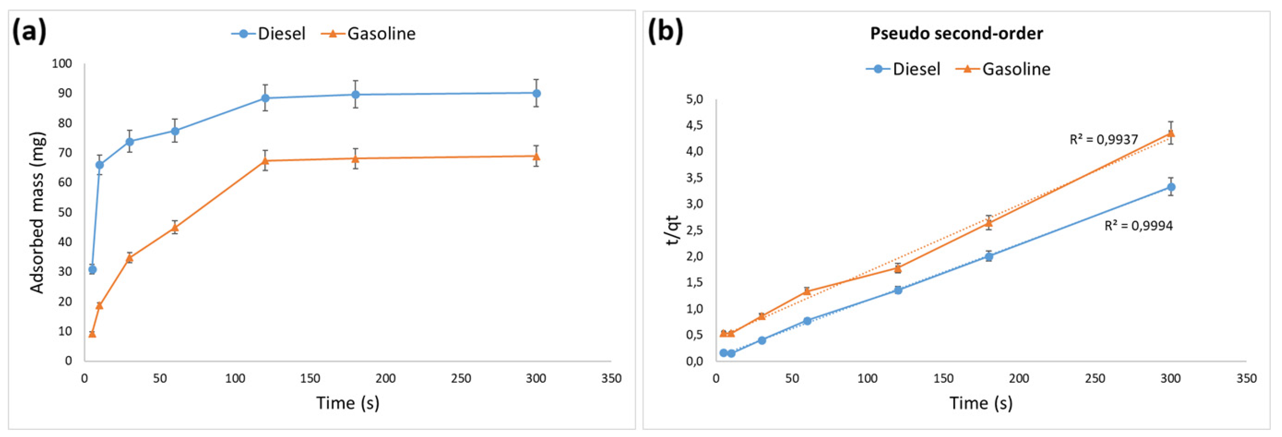 2.4. Sorption Capacity Test in Continuous Flow Using Fuel/Water System