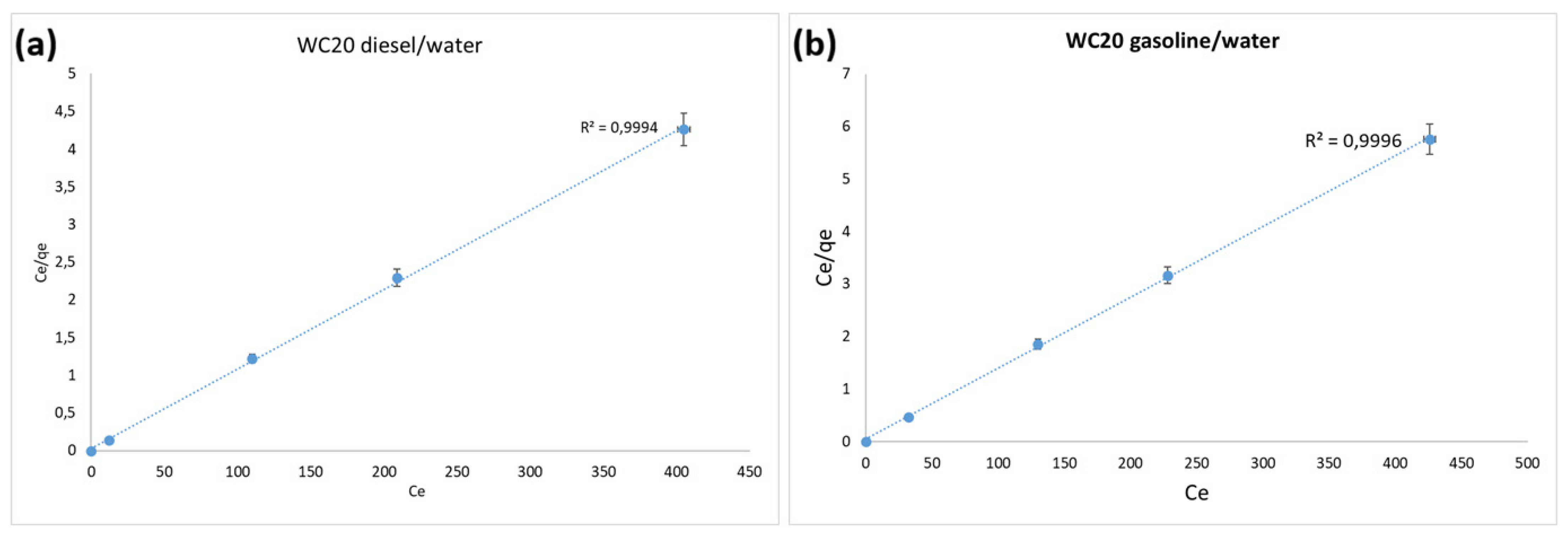 3.3.2. Adsorption Isotherms of WC20 in Diesel/Water and Gasoline/Water Systems