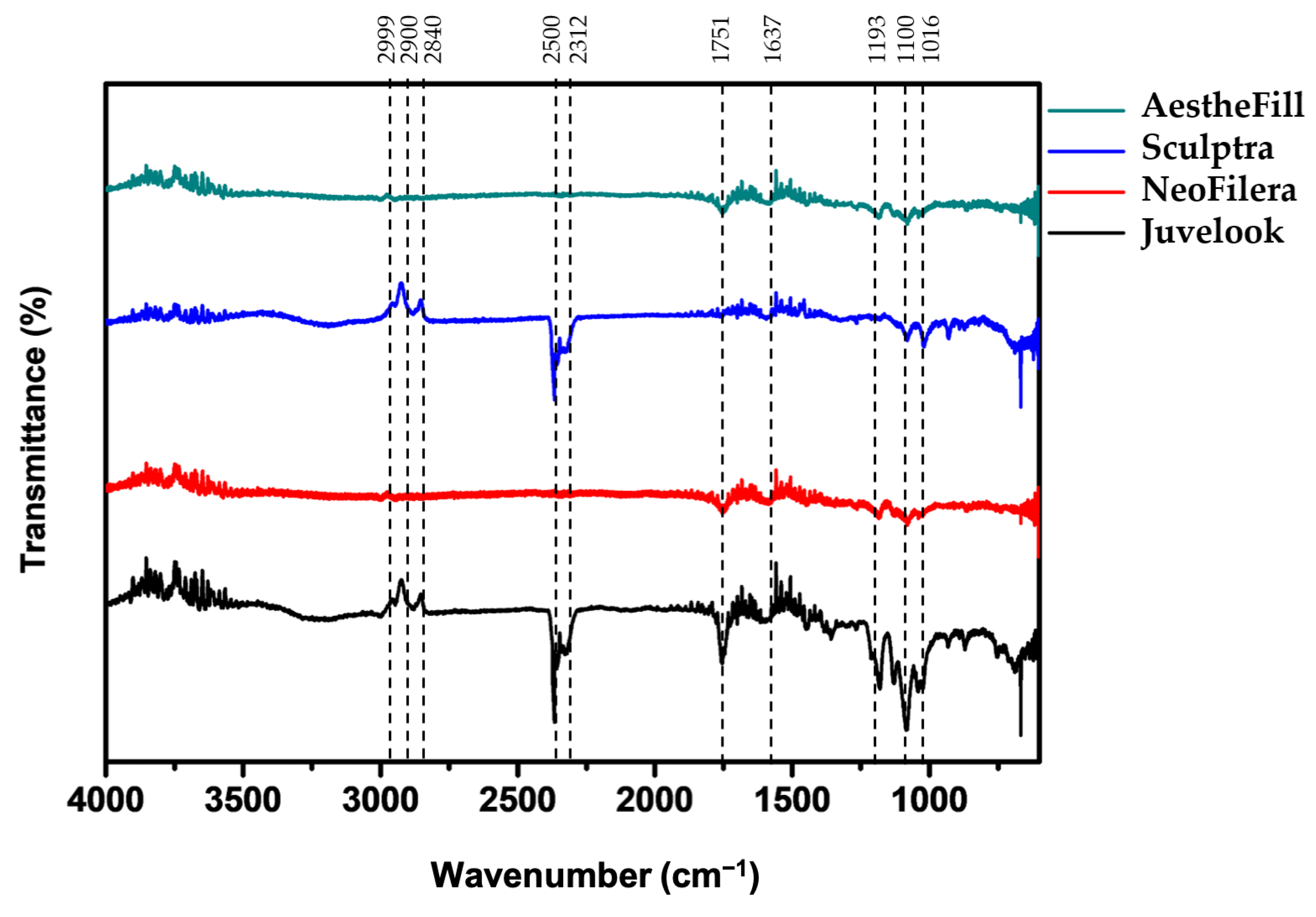 3.1. Functional Group Profiles of All Dermal Fillers Are Largely Similar