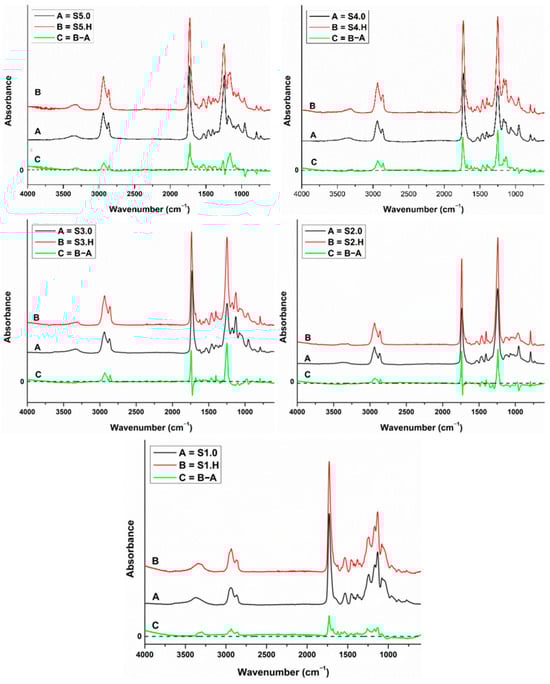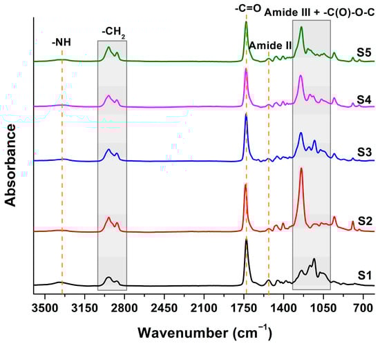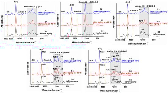 The changes in the structures of the obtained poly(ester-urethane)s after thermal aging were not significant and the samples kept their structural integrity, as shown in Figure 2. The polyurethanes S4 (with poly(1,4 butylene adipate) diol as soft segments)) and S5 (with polycaprolactone diol as soft segments) underwent slight changes in the amide I and amide III regions. The -C=O urethane bands shifted from ≈1730 cm−1 to ≈1725 cm−1 after the thermal treatment. This suggests enhanced formation of hydrogen-bonded urethane groups. These changes were corroborated with increases in the amide III and -C(O)-O-C bands, which confirmed the formation of a network with a higher density of inter- and intramolecular hydrogen bonding.