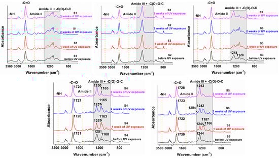 After up to three weeks of UV exposure (Figure 3), the structures of the polyurethanes remained relatively unchanged, indicating that these formulations may confer structural stability under weathering conditions. The use of PBA (S4) and PCL (S5) as soft segments led to small changes in the 1300–1000 cm−1 range. There was an increase in the intensity of the -C(O)-O-C bands, suggesting a rearrangement of the macromolecular chains and leading to a more defined network. However, there was a slight decrease in the hydrogen bonded -NH stretching vibration in the range of 3700–3200 cm−1 which indicated some loss of the urethane structure [46].