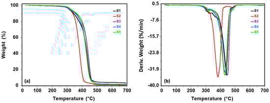 All polyurethanes presented good thermal stability with a 5% mass loss at temperatures over 315 °C. The polyester type does not significantly influence the initial degradation temperature. The highest stability was achieved for S5 polyurethane (T5% = 328 °C) with PCL as the soft segment. All samples showed three stages of degradation, and the characteristics of each stage are summarized in Table 2. The first stage corresponds to the decomposition of the urethane bonds from the hard segments. The second stage is associated with the scission of the soft segments, and the last stage is related to the decomposition of some recombined fragments [47,48]. The main degradation process is observed in the second step, where weight loss exceeded 70%. Surprisingly, the lowest thermal stability (T5% = 315 °C and Tmax = 384 °C) was obtained for S2 polyurethane, which contains poly(hexamethylene carbonate) diol. Poly(hexamethylene carbonate) diol should impart better thermal stability due to the carbonate linkage, which restricts segmental mobility and enhances dimensional stability. However, sucrose incorporation in the second reaction step disrupted network integrity, concealing the expected effect and lowering the thermal stability relative to other polyester urethanes. The highest Tmax value was obtained for S3 polyurethane (447 °C), which was synthesized with poly(diethylene glycol adipate). Char residues found at 700 °C varied from 0.47% to 3.35%. The lowest percentage (0.47%) was obtained for S2 polyurethane, in line with its reduced thermal stability.
