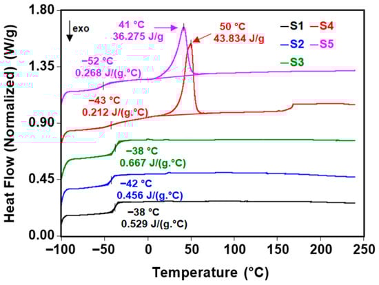 The DSC approach is a handy and effective method for experimental characterization, as it can determine the glass transition, melting, and crystallization temperatures of polymeric materials. It can be used to monitor the modification of the transition after aging. DSC thermograms from the second heating run are shown in Figure 5, and the corresponding thermal parameters are included in Table 3. The different polyester diols had a significant role in the glass transition temperature. The Tg values associated with the soft segments, i.e., polyesters, increased from −52 °C (for S5) to −38 °C (for S1 and S3 samples). The rigid backbone of poly(ethylene adipate) and poly(diethylene glycol adipate) raised the Tg of the polyurethanes, restricting chain mobility. Differences in chain mobility, dictated by the polyester diol type, are also mirrored in the heat capacity trend. Indeed, a decrease in the heat capacity values from 0.5–0.6 J g−1 C−1 (S1 and S3) to 0.2 J g−1 C−1 (S4 and S5) was observed.