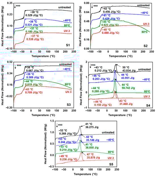 DSC thermograms of the sucrose-based poly(ester-urethane)s: untreated, thermally aged (−40 °C and 80 °C), and UV irradiated (UV.3).