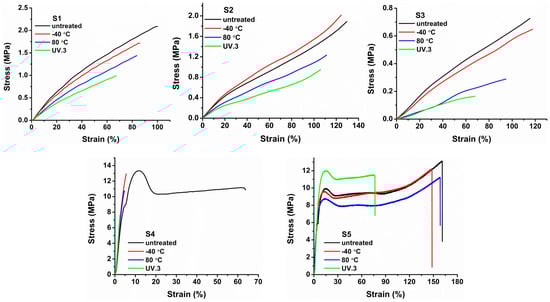 Stress–strain curves of the sucrose-based poly(ester-urethane)s: untreated, thermally aged (−40 °C and 80 °C), and UV irradiated (UV.3).