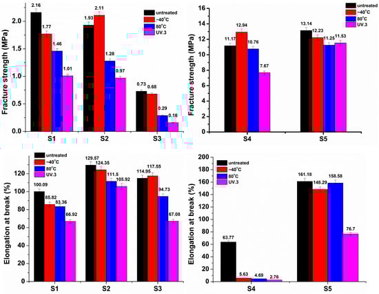 Fracture strength and elongation at break of the sucrose-based poly(ester-urethane)s: untreated, thermally aged (−40 °C and 80 °C), and UV irradiated (UV.3).