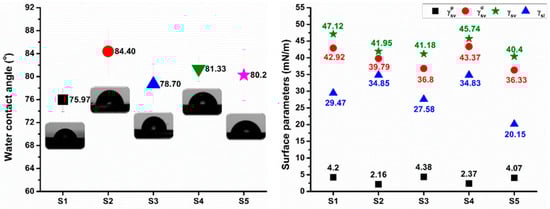 where θ stands for the experimentally obtained contact angle values, and represent the surface free energy of solid/liquid in equilibrium with the saturated vapor of the liquid, is the interfacial free energy of solid to liquid, and are the polar components of the surface free energy, and and are the dispersive components of the surface free energy. Surface parameters were obtained using Milli-Q water (Millipore, ≥18.2 MΩ cm) and diiodomethane as wetting liquids, since the most trustworthy results require data from a polar–non-polar liquid pair [56]). The values are plotted in Figure 9.