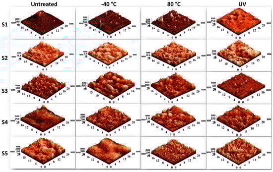 The surface morphology was examined using AFM and SEM techniques. AFM provides information regarding microphase separation and domain morphology, since the hard and soft segments of the polyurethanes are well-highlighted due to their distinct contrast (light zones indicate hard domains, while dark zones indicate soft domains). The 20 × 20 μm 3D AFM images in Figure 11 show the surface morphology of polyurethane films in their untreated state and after high- and low-temperature treatment and UV irradiation. The values of the root mean square roughness (Sq) are inserted into Table 5.