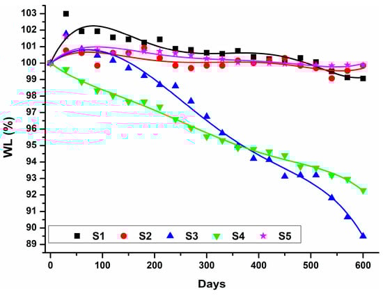 The variation in the weight ratio as a function of hydrolytic degradation time of the obtained sucrose-based poly(ester-urethane)s is illustrated in Figure 13. The S3 and S4 samples had a decreasing trend of the weight ratio after water immersion, reaching a value of 8–10% after 600 days of water immersion. Instead, the S2 and S5 samples had an almost linear evolution of the weight ratio, being stable in aqueous medium, even after almost two years. The weight ratio of the S1 sample increased throughout the first 100 days, indicating water intake.