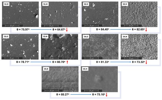 The effect of the aqueous medium on the samples’ surfaces was investigated using SEM and the contact angle technique. The results are shown in Figure 15. SEM micrographs after the hydrolytic treatment indicate surface alterations, especially for the S2, S3 and S4 samples. There are significant changes in surface morphology, similar to the changes previously noted after thermal aging. This behavior is in good correlation with the weight loss ratio for S3 and S4 polyurethanes. Despite minor surface modifications, the S2 sample showed an almost constant weight during the hydrolytic process. The hydrophobicity of PCL segments limits the overall hydrolytic degradation of the obtained polyurethane (S5) and, therefore, the surface is less damaged [65].