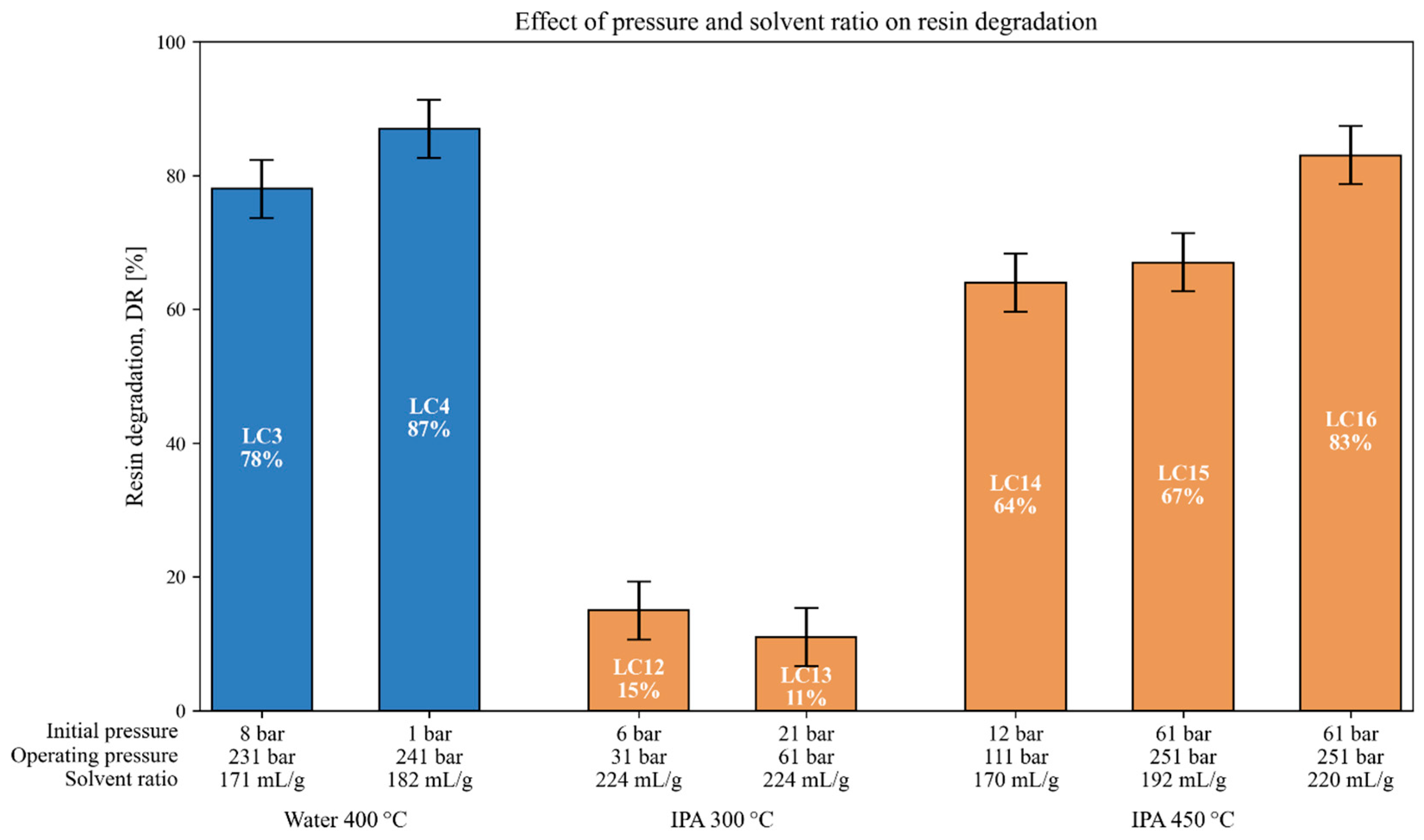 3.4. Interrelated Effects of Pressure and Solvent Ratio on Resin Degradation
