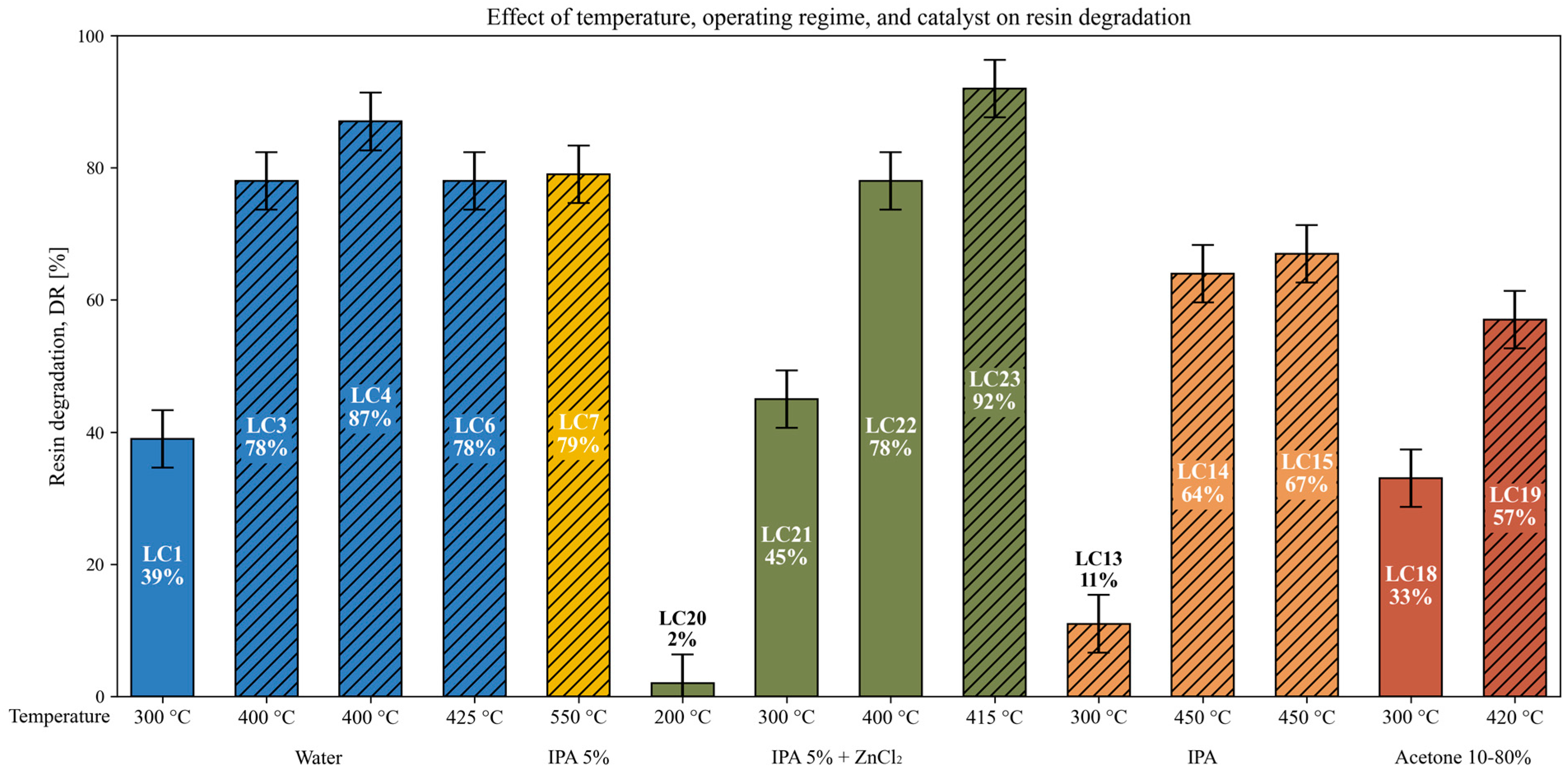 3.6. Effect of Temperature, Operating Regime, and Catalyst on Resin Degradation