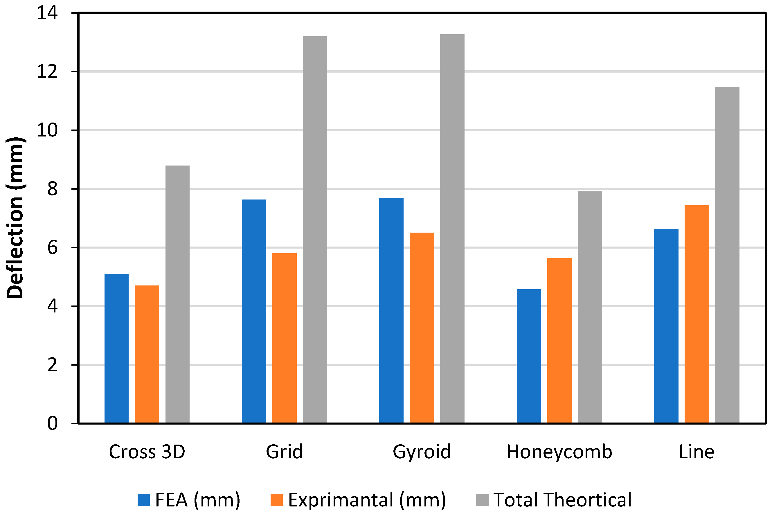 | Infill Pattern | Peak Load (N) | Deflection at Peak (mm) | Plateau Near 20 mm (N) | Behavior Note |