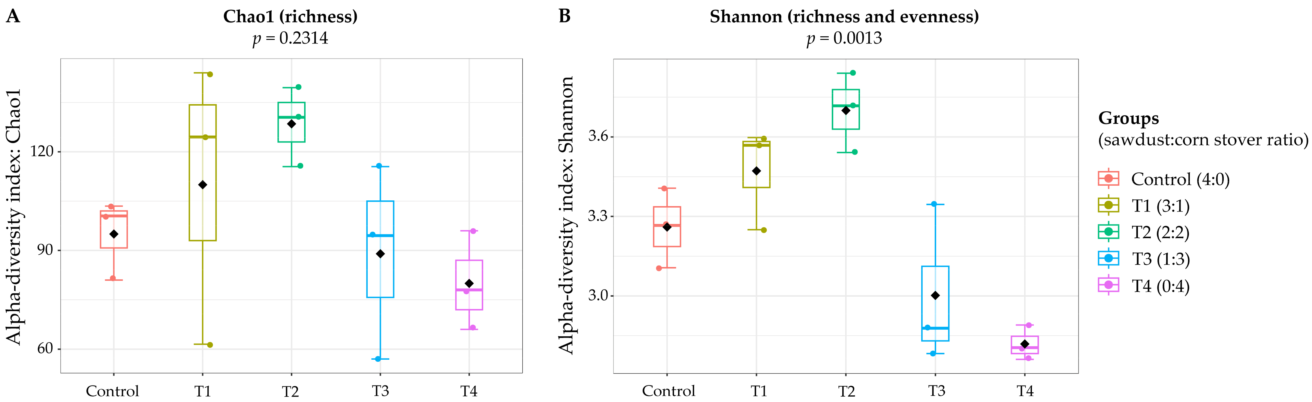 Five flake soil formulations, including C, T1, T2, T3, and T4, underwent 16S rRNA gene sequencing using the Oxford Nanopore MinION platform. The treatments (T1–T4) represented a lignin-to-cellulose gradient, with the control being most lignin-rich (sawdust-based) and T4 entirely cellulose-based (corn stover-based). Alpha-diversity analysis revealed distinct variation in microbial richness and evenness among treatments (Figure 1). Richness (Chao1 index) ranged from 77.3 ± 12.7 in T4 to 122.3 ± 18.6 in T2 (Kruskal–Wallis, p = 0.2314). Shannon diversity differed significantly (p = 0.0013), being highest in T2 (3.82 ± 0.23) and lowest in T4 (2.86 ± 0.08). Although pairwise contrasts lost significance after multiple-test correction, unadjusted comparisons indicated the greatest differences between T2 and T4 and between C and T4.
