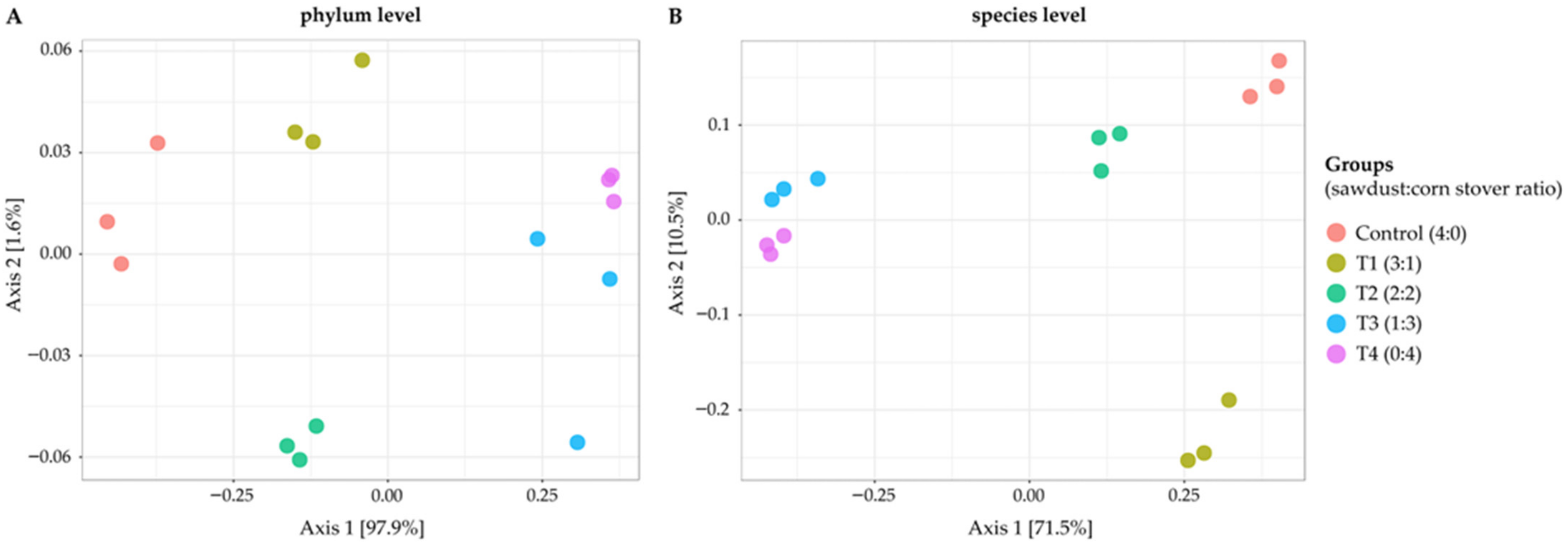 Beta-diversity analysis revealed strong clustering by treatment, reflecting substrate-driven microbial structuring (Figure 2). At the phylum level (Figure 2A), principal coordinate analysis (PCoA) showed Axis 1 explained 97.9% and Axis 2 1.6% of variation. Control samples clustered tightly and distinctly from other treatments, while T1 occupied an intermediate position, and T3 and T4 (corn stover-based) clustered together on the opposite side of the ordination space. The clear separation between lignin-rich (C and T1) and cellulose-rich (T3 and T4) groups indicates a strong influence of substrate composition on community structure. At the species level (Figure 2B), Axis 1 explained 71.5% and Axis 2 10.5% of variation. Control and T1 formed distinct clusters, T2 grouped centrally, and T3–T4 clustered tightly together. The more pronounced separation at the species level indicates that treatment effects extended beyond phylum shifts to species-specific differences, confirming that substrate type fundamentally restructured microbial assemblages.