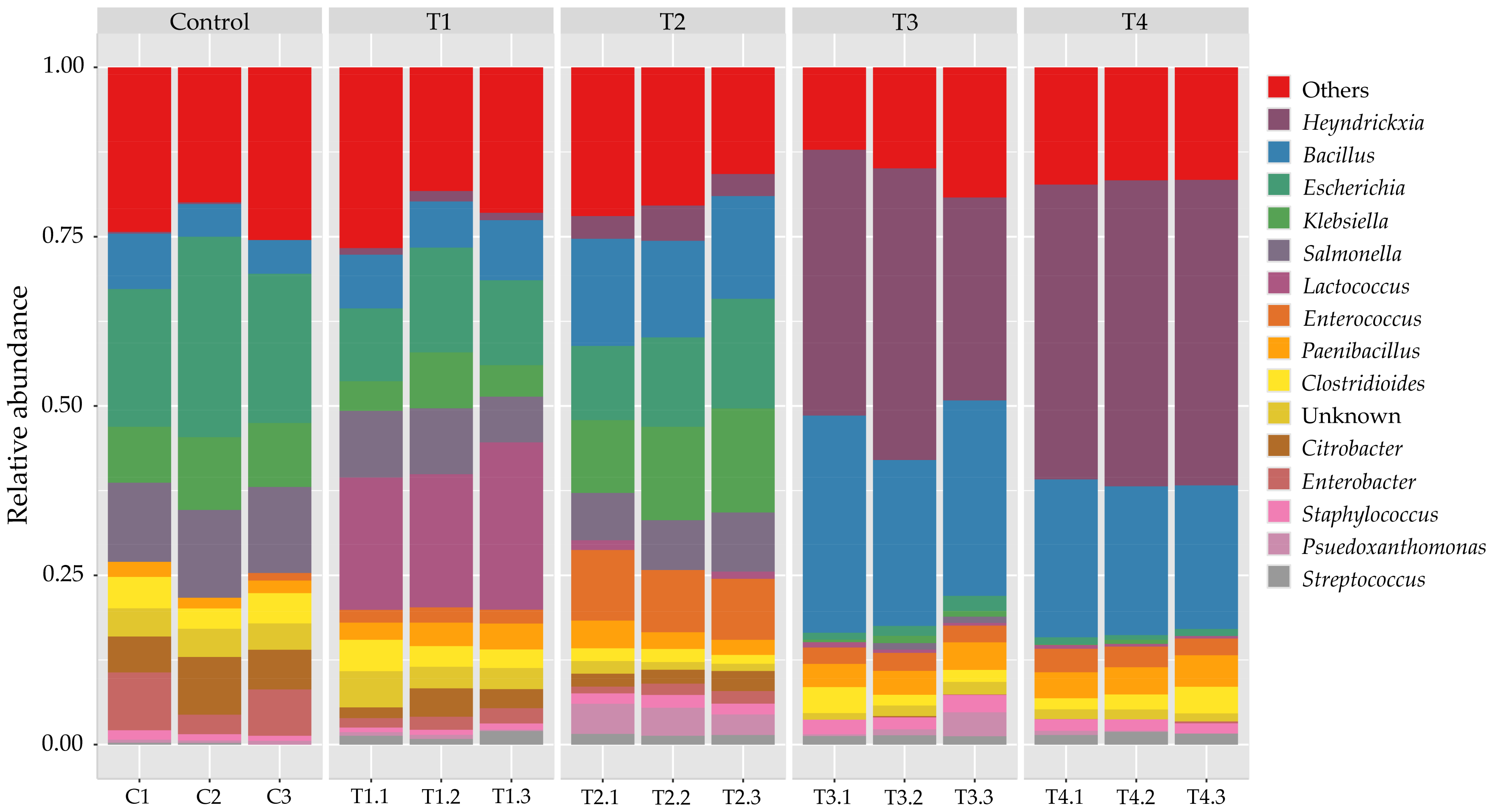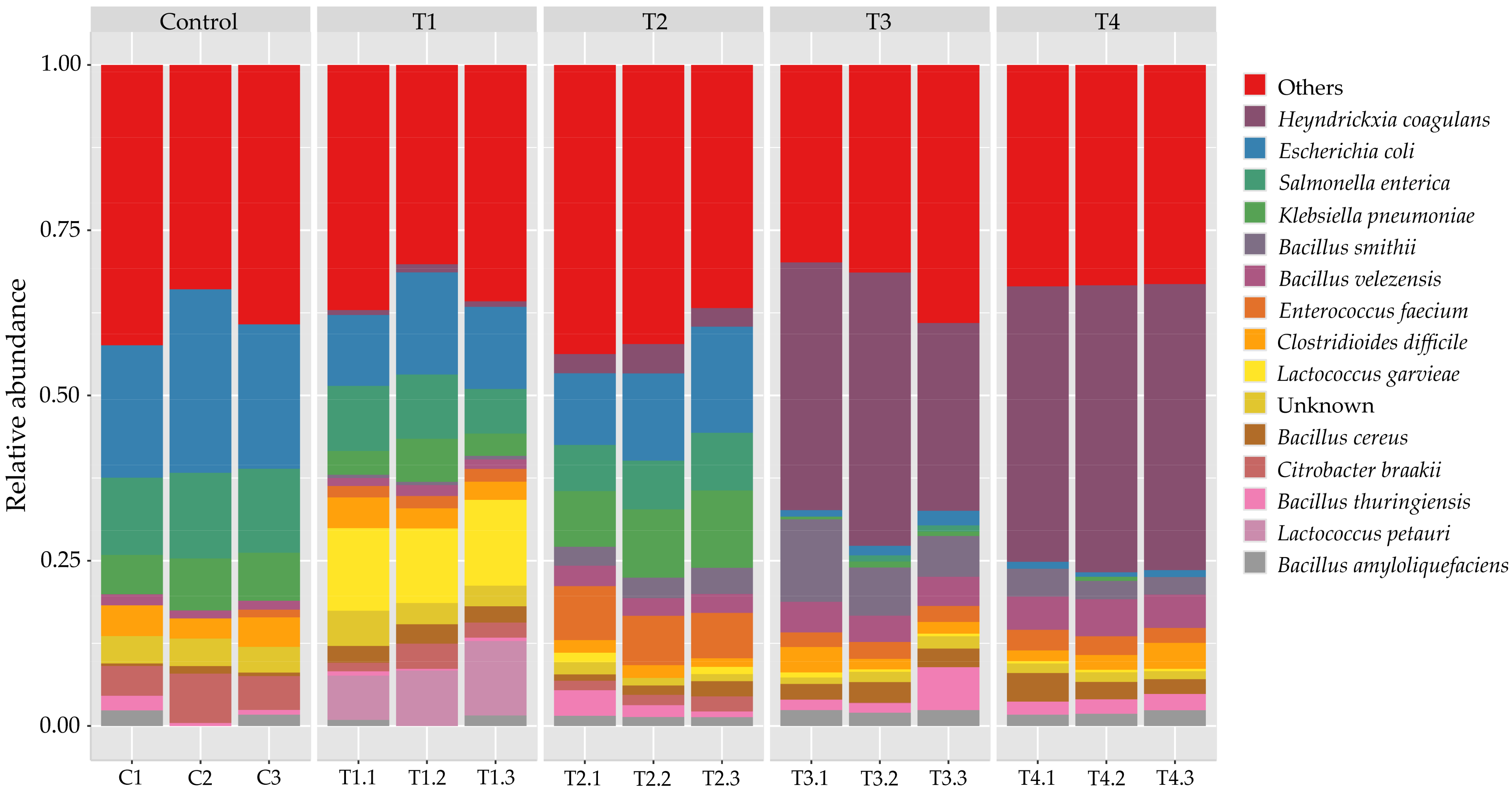 At the species level (Figure 4), Bacillus cereus, B. anthracis, and Listeria monocytogenes were among the most represented identified taxa, accompanied by C. difficile, K. pneumoniae, and E. faecium. Although these taxa are widely distributed in environmental and feed microbiomes, their relative enrichment in the commercial product highlights the need for careful microbiological quality control, especially for substrates used in rearing biological organisms such as beetles. In the control group (C), the community was dominated by gut-associated Enterobacteriaceae, particularly E. coli, S. enterica, and K. pneumoniae. Opportunistic pathogens such as C. difficile and E. hormaechei were also detected, underscoring the potential risk of pathogenic reservoirs in sawdust-based flake soils. This is not surprising, as flake soil contains cattle manure, which provides a source of decomposer microorganisms and commonly harbors human pathogens, including E. coli, S. enterica, and K. pneumoniae [23]. With moderate corn stover supplementation (T1–T2), pathogenic Enterobacteriaceae declined, while LAB expanded significantly. These taxa are recognized for their probiotic roles in animal feed and silage fermentation, producing lactic acid that suppresses pathogens and stabilizes feed microbiota [24]. Spore-forming Bacillus species, such as B. velezensis, B. thuringiensis, and B. amyloliquefaciens, also increased moderately. By contrast, corn stover-based (T3–T4) were dominated by fermentative spore-formers. Heyndrickxia coagulans emerged as the single most dominant species. This species, formerly classified as B. coagulans, is notable for lactic acid production and probiotic potential in livestock feed [59,60]. Other Bacillaceae, including B. smithii, B. velezensis, B. cereus, and Paenibacillus polymyxa, were also enriched. Importantly, pathogenic taxa such as S. enterica, K. pneumoniae, and E. coli were nearly eliminated in T4, suggesting competitive exclusion by LAB and Bacillaceae, supported by acidification of the flake soil [24,59].