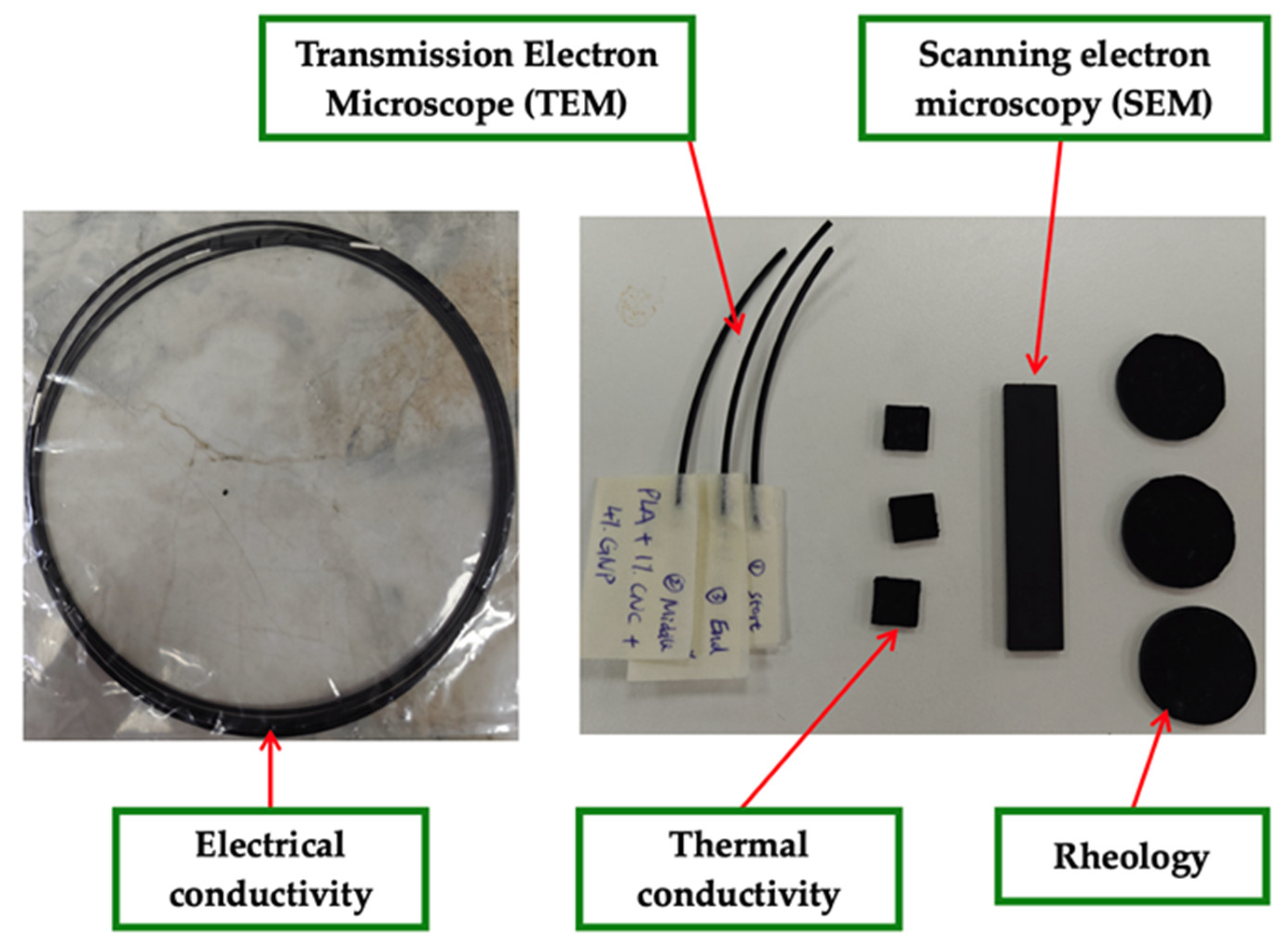 Test samples were prepared according to the specific dimensional and surface requirements of each characterisation method. Disc-shaped specimens (Ø20 mm × 1.0 mm thickness) were used for rheological measurements whereas square specimens (10 mm × 10 mm × 2.0 mm) for thermal conductivity tests. All samples were fabricated by hot-pressing PLA and PLA-based composite pellets using a Carver 3850 hot press at 180 °C under 2 tons of pressure, followed by natural cooling to room temperature to prevent thermal cracking. Electrical conductivity was evaluated separately using 1 m long filaments, and both ends were coated with 1 cm long silver paint to ensure stable ohmic contacts with the measuring electrodes. The silver coating does not affect the measurement, as it is measured the bulk conductivity. Photographs of the prepared samples are shown in Figure 1.