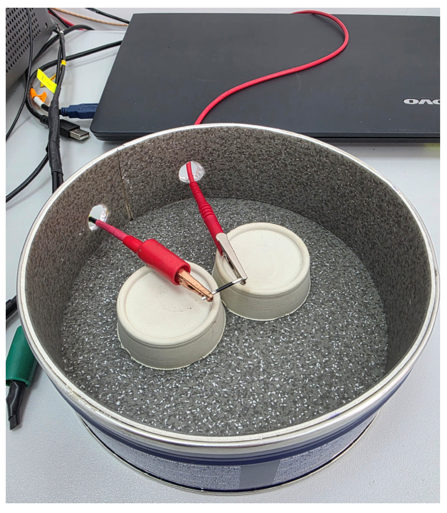 The electrical resistance was tested by the multimeter Keithley 6517B (Keithley Instruments Inc., Cleveland, OH, USA) using the R-mode test in a two-point probe configuration. To minimise external electromagnetic interference and leakage currents, all measurements were performance inside our custom-built shielding metal chamber using Triax cables (Figure 2). Samples were prepared with a fixed conductive length of 10 mm between two 10 mm silver-coated ends to minimise resistance and ensure measurable current within the instrument’s optimal range. It is worth mentioning that shorter samples length provided higher measured current at the same voltage and lower relaxation current. Therefore, the sample preparation presented in Figure 1 was modified (Figure 2). The filament diameter was measured at the centre of the filament using a precision micrometre. Due to the sample short length, diameter variation was not expected. Also, the error in diameter was maintained below ± 1%, corresponding to an approximately ± 2% error in conductivity.