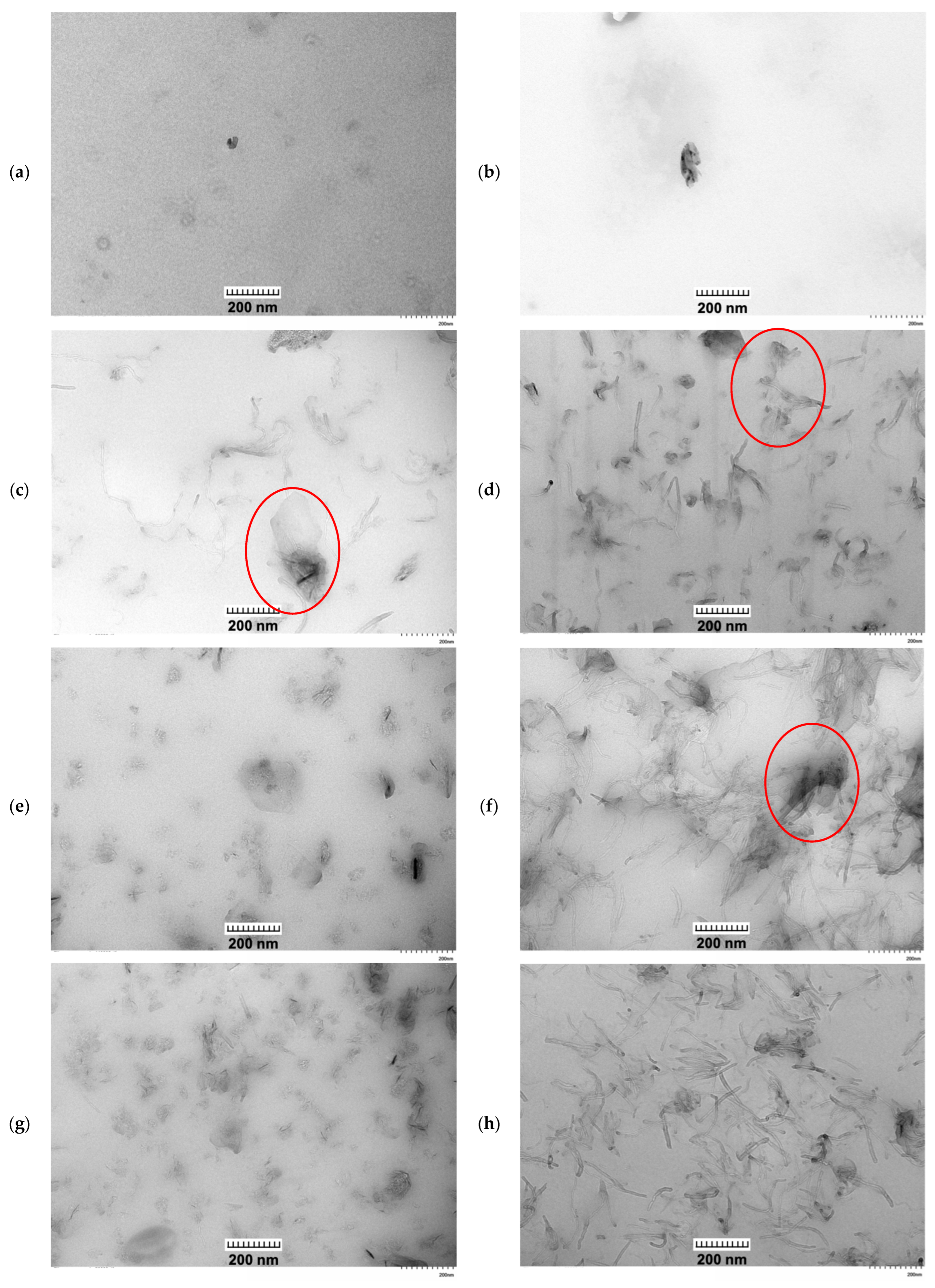 A transmission electron microscopy (TEM) analysis was performed by Hitachi HT7800 (Hitachi High-Tech Corporation, Tokyo, Japan) at an acceleration voltage of 100 kV. Filament samples (~10 mm) were mounted in a Reichert Jung Ultramicrotome chuck, trimmed under a stereomicroscope to a ~300 µm trapezoid, and sectioned with a diamond knife into 100 nm slices. Sections were collected on 300-mesh nickel grids. The prepared samples were observed under varying magnifications to investigate their internal morphology, dispersion state, and orientation of nanofillers within the PLA matrix from the micro- to nanoscale level.