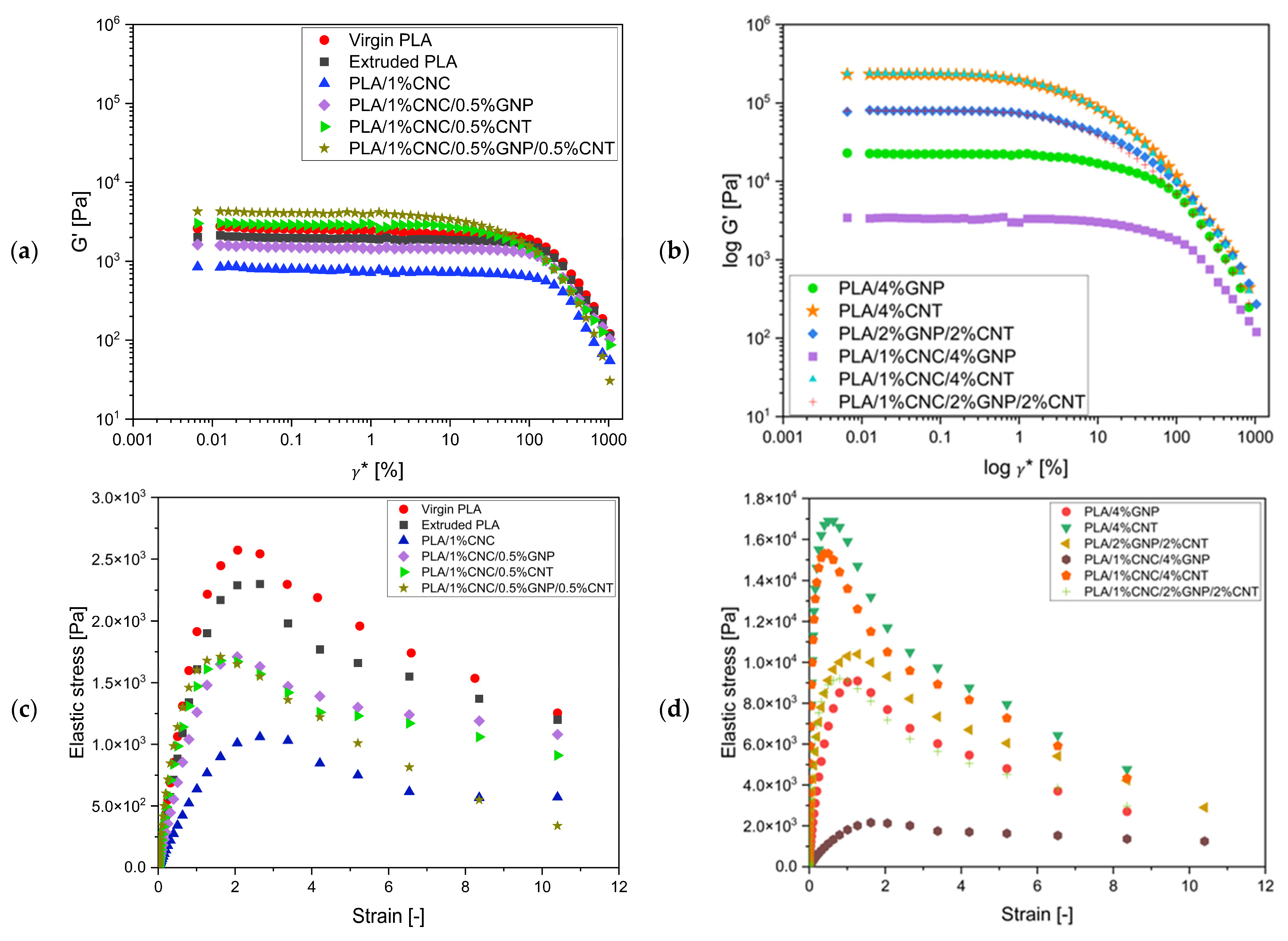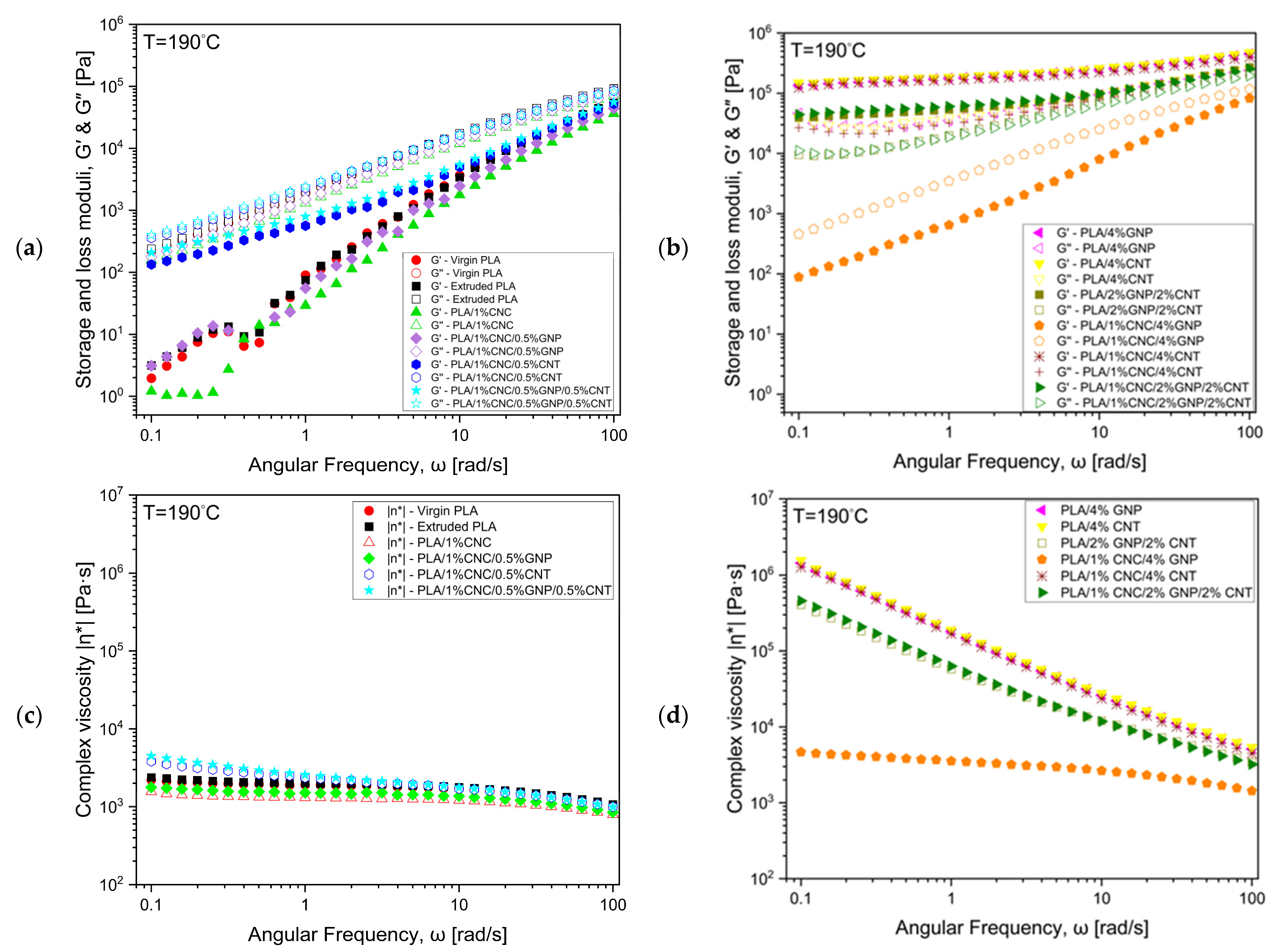 After the LVR was established, frequency sweep tests were conducted at 190 °C with the linear region to examine the viscoelastic behaviour of the samples. The tests covered an angular frequency range of 0.1–100 rad/s. For neat PLA and composites containing 0.5 wt% carbon nanofillers, a constant strain of 1% was used. In contrast, for composites with higher nanofiller loadings, the strain was reduced to 0.5% to ensure the measurements remained within the LVR and to maintain data accuracy.