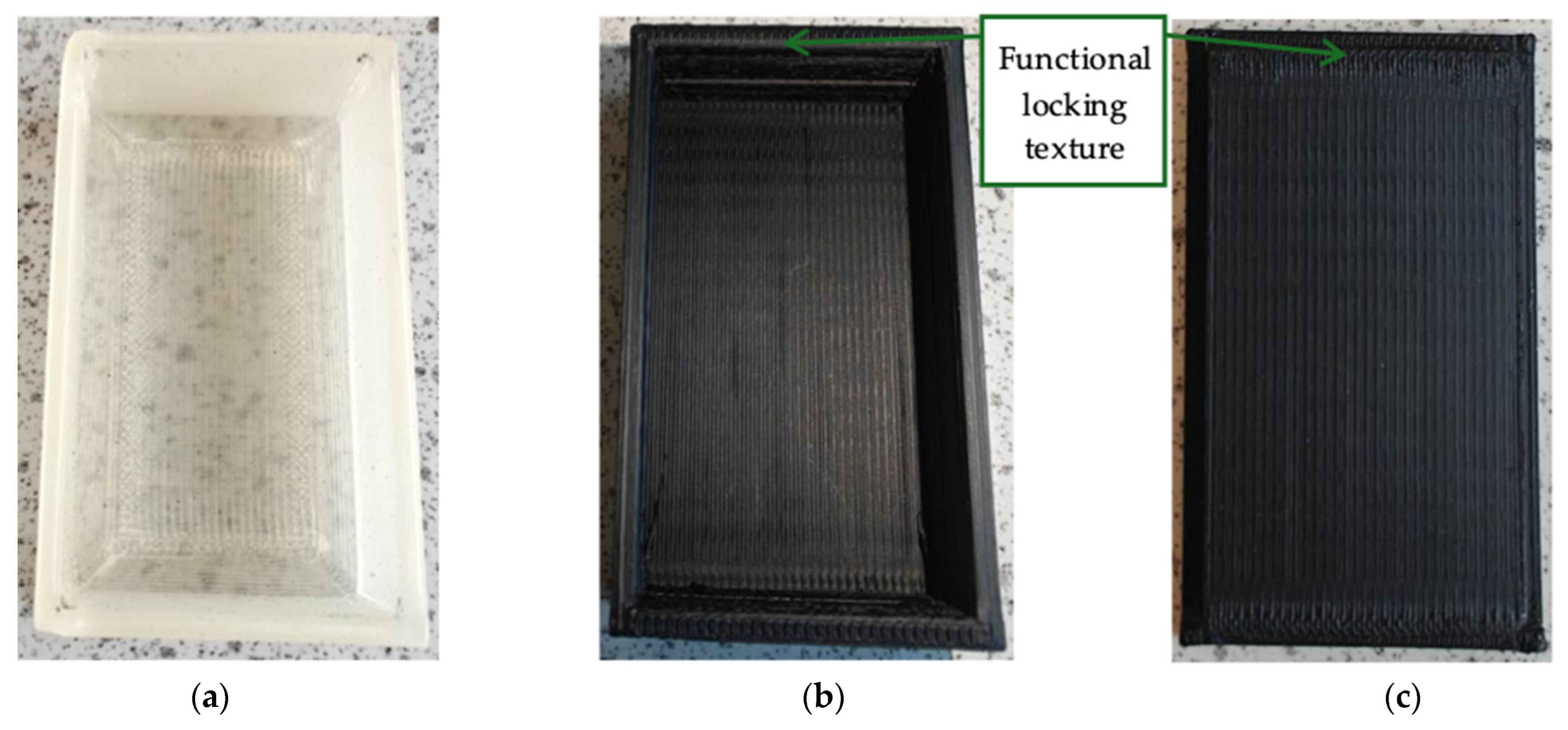 Prototype boxes and lids were produced through FDM 3D printing using PLA-based nanocomposite filaments produced as described in Section 2.2. The box, with dimensions of 35 mm × 60 mm × 17 mm, and 2 mm thickness were modelled and then 3D printed using the PLA, PLA/1% CNC/4% GNP, and PLA/1% CNC/2% GNP/2% CNT filaments. The lid, with dimensions of 35 mm × 60 mm and 4 mm thickness, was also printed using the same filaments. The 3D printing was performed using a fused deposition modelling (FDM/FFF) 3D printer (X400 PRO, German RepRap, Feldkirchen, Germany) equipped with an extrusion nozzle of 0.4 mm diameter. The printing parameters were set to a nozzle temperature of 200 °C, an extrusion speed of 50 mm/s, and the heated platform temperature of 65 °C. Samples were printed with a layer height of 0.2 mm and 100% infill, with each layer deposited in a rectangular direction of one layer to another.