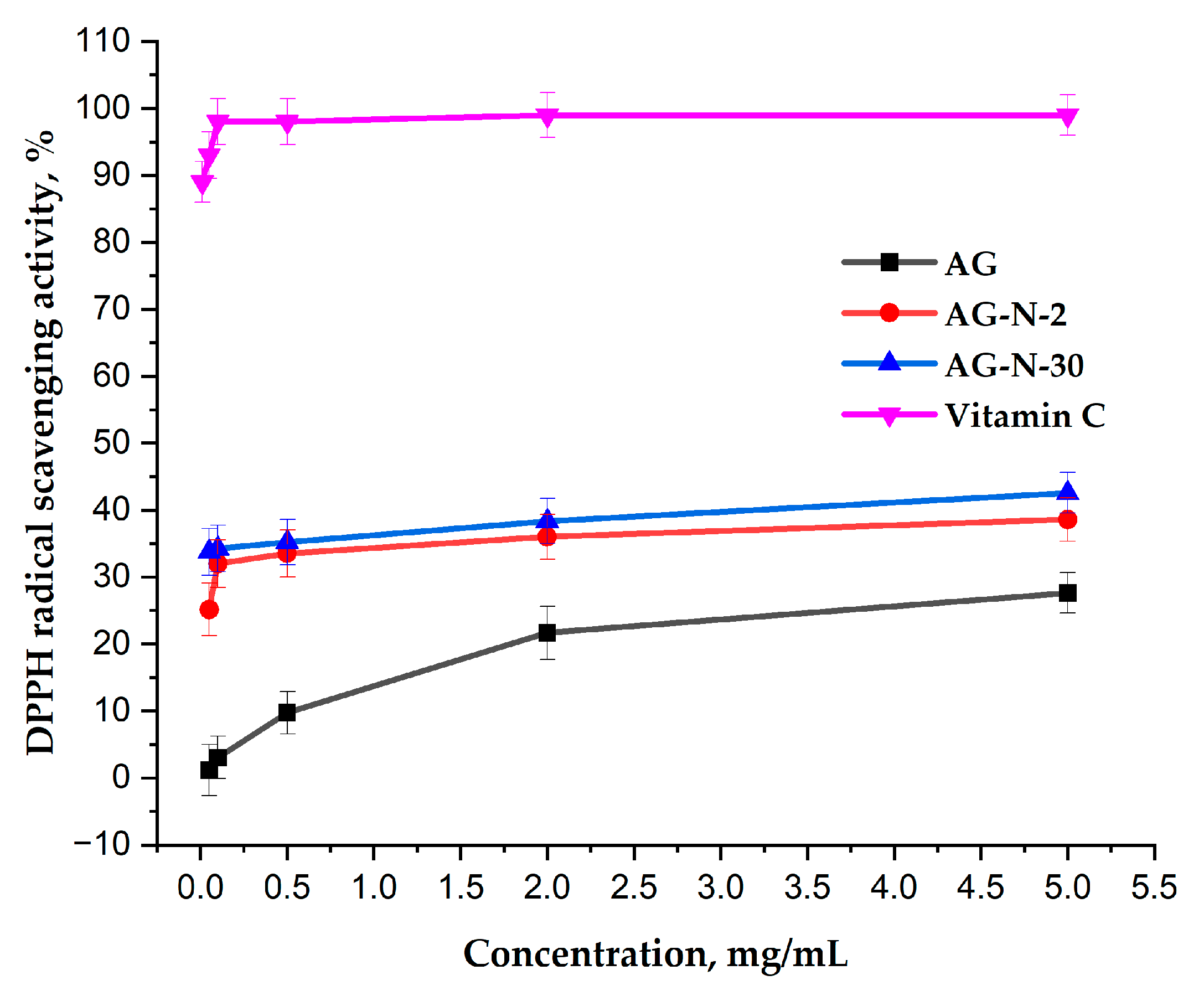 3.7. Antioxidant Activity of the Initial AG and Its Quaternized Derivatives