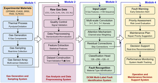 To summarize, existing gas analysis methods still face significant limitations when dealing with gas cross-interference and compound fault identification caused by the concurrent multi-mechanism aging of cable insulation materials. To address this issue, this study proposes a DCNN-based multi-label classification framework to accurately identify the gas generation characteristics of five typical insulation materials (EPDM, EVA, SR, PA, XLPE) used in power cables with voltage level between 10 kV–220 kV under complex fault conditions. The overall operational workflow of the proposed method is illustrated in Figure 1.