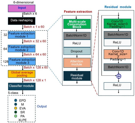 Since different gas components (CO2, C2H4, C2H6, CH4, CO, H2) exhibit distinct concentration variation patterns and response characteristics during the degradation processes of different materials, traditional convolution operations often fail to effectively distinguish which feature channels are most critical for identifying a specific material. The attention mechanism, by adaptively learning channel weight coefficients, can dynamically highlight the most discriminative feature channels for the current input sample while suppressing noise and irrelevant information. Specifically, when the network processes sensor data from EPDM materials, the attention module may automatically enhance the feature channels associated with variations in C2H4 and C2H6 concentrations, since these gases typically show high response sensitivity during the degradation of EPDM. In contrast, for PA materials, the attention mechanism may focus more on channels related to CO and H2, as these gases serve as stronger indicators in the thermal decomposition of polyamide. This adaptive feature selection capability significantly enhances the model’s ability to discriminate between different material categories. Particularly when dealing with noise interference and baseline drift, which are common in sensor data, the attention mechanism can effectively filter out irrelevant information and concentrate on feature patterns that truly contribute to classification decisions, thereby improving both the accuracy and robustness of the model’s recognition performance.