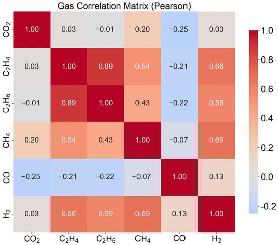 Figure 9 shows the Pearson correlation coefficient heatmap among gases, visualizing the pairwise relationships of six gas concentrations (CO2, C2H4, C2H6, CH4, CO, and H2) across all material samples. This correlation heatmap provides insights into the interdependencies and redundancies within the gas sensor array. The color-coded matrix displays Pearson correlation coefficients ranging from −1 to +1, where red indicates positive correlation, blue indicates negative correlation, and white indicates no correlation. The diagonal elements are always 1, representing perfect self-correlation. This analysis reveals the degree of multicollinearity among gas measurements, which is crucial for understanding feature redundancy and guiding dimensionality reduction strategies. Strong correlations between certain gas pairs may suggest shared emission mechanisms or chemical pathways, while weak correlations indicate independent emission processes. The correlation structure directly influences the design of optimal sensor arrays, feature selection algorithms, and the interpretation of classification results. Understanding these relationships is essential for developing robust classification models and avoiding overfitting caused by redundant features.