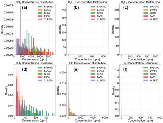 Figure 10 illustrates the concentration distribution characteristics of six gases (CO2, C2H4, C2H6, CH4, CO, H2) across different insulation material samples. The chart adopts a 2 × 3 subplot layout, with each subplot corresponding to the histogram of one gas concentration distribution. Through density normalization, the distribution differences among material types (EPDM50, EVA50, SR50, PA50, XLPE50) under the same gas concentration can be clearly observed. The distribution plots reveal significant variations in gas concentrations generated during the thermal aging of different insulation materials, reflecting differences in their thermal decomposition properties and aging mechanisms. For instance, some materials may exhibit more concentrated distributions within specific gas concentration ranges, while others display more dispersed distribution patterns. These distribution characteristics provide important feature information for material identification and classification, contributing to a better understanding of the degradation behavior of different insulation materials under thermal stress.