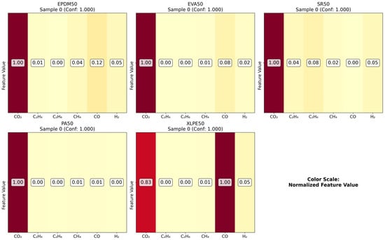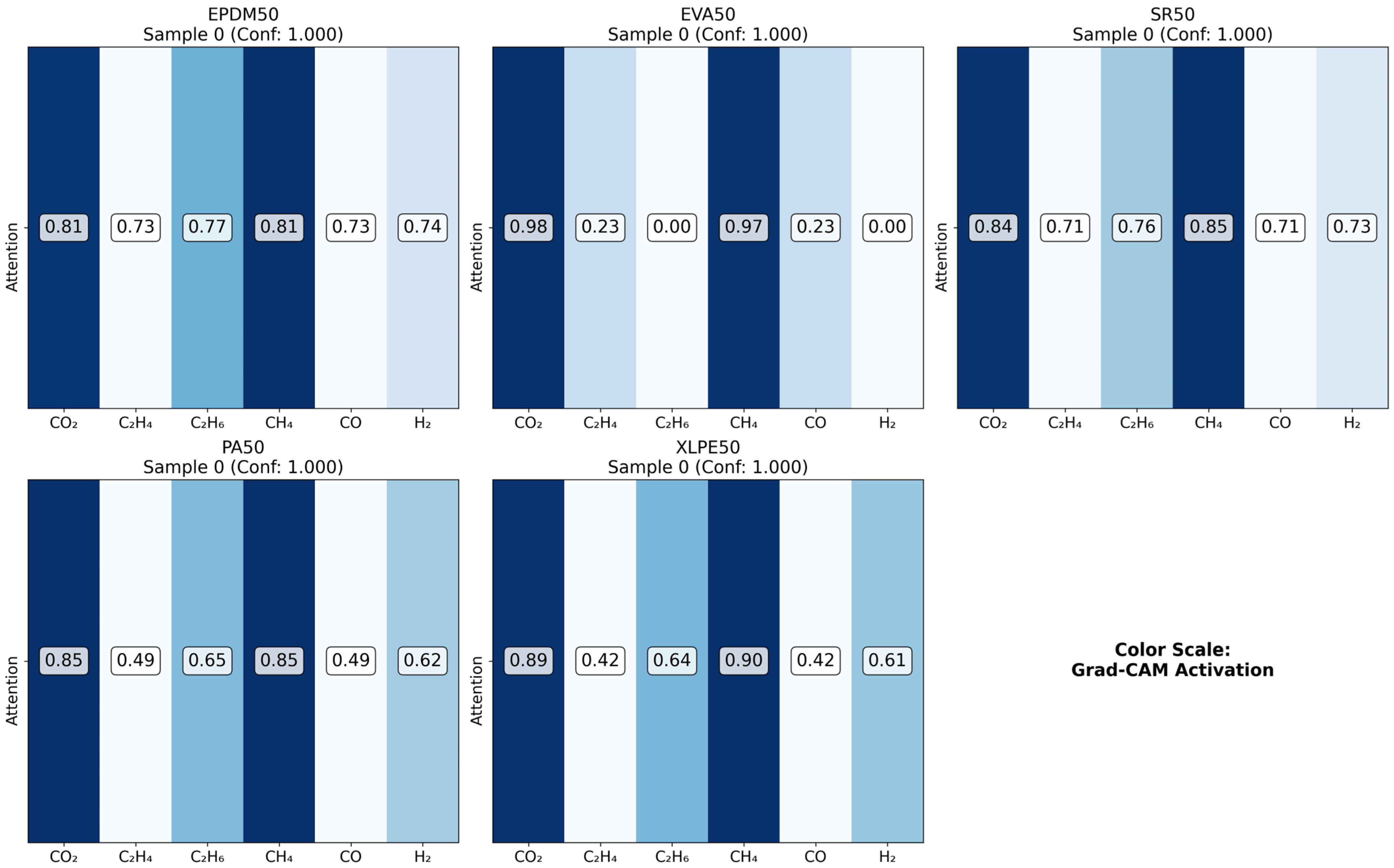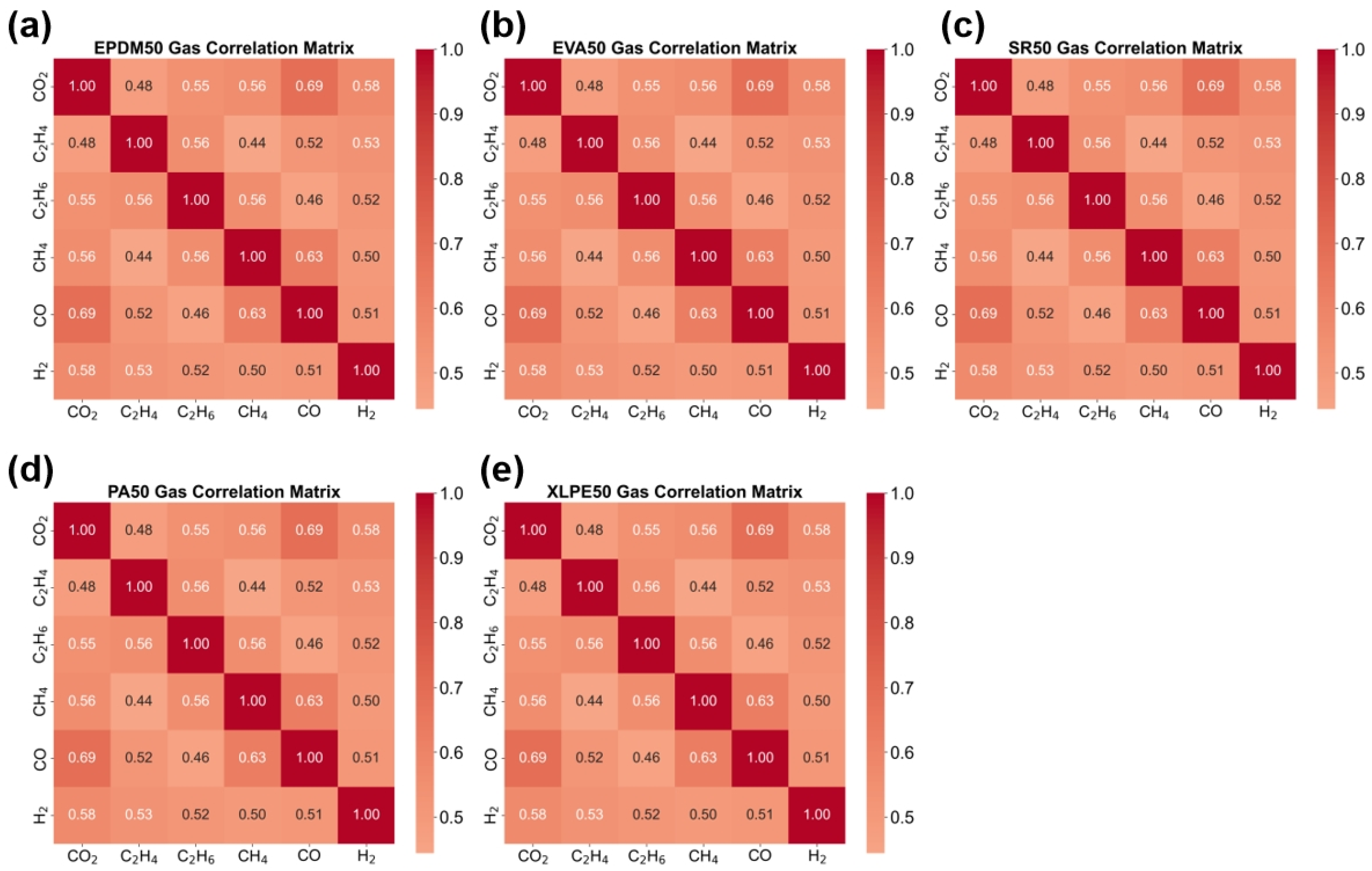 Figure 8 presents the gas correlation heatmaps for the five insulation materials, with each subplot corresponding to one material (EPDM50, EVA50, SR50, PA50, XLPE50). This material-specific correlation analysis reveals the unique gas-generation patterns of different insulation materials during thermal aging. Each material exhibits distinct gas correlation characteristics, reflecting how differences in chemical composition and molecular structure influence thermal decomposition pathways. By comparing the correlation patterns across materials, material-specific gas-generation mechanisms can be identified, which hold significant value for material classification and aging state assessment. Some materials may demonstrate stronger inter-gas correlations, while others may display more independent gas-generation patterns. These differences provide a distinctive feature space for insulation material identification based on gas analysis.