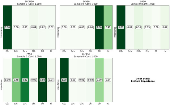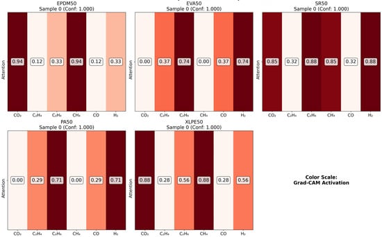As illustrated in the figures below (Figure 14, Figure 15, Figure 16 and Figure 17 in the revised manuscript), they collectively form a multi-level visualization framework from raw feature distributions to deep learning attention mechanisms, systematically revealing the DCNN’s internal workings and feature discrimination rules in material gas sensing data classification. Figure 14 presents the normalized distribution patterns of six gas features (CO2, C2H4, C2H6, CH4, CO, H2) across five polymer materials (EPDM50, EVA50, SR50, PA50, XLPE50) via a heatmap. The YlOrRd colormap normalizes values to [0, 1], facilitating cross-material comparison of feature distribution differences. Using Grad-CAM, Figure 15 visualizes the attention of the first convolutional layer to different gas features. Red regions indicate high activation, reflecting the model’s ability to identify key discriminative features. Figure 16 shows Grad-CAM results for the second convolutional layer, revealing attention evolution in deeper feature abstraction. Blue heatmaps indicate the model’s shift from raw to abstract features. Figure 17 quantifies gas feature contributions to material classification by multiplying feature values with Grad-CAM activation weights. Green heatmaps highlight feature importance, with higher values indicating greater criticality in material discrimination.