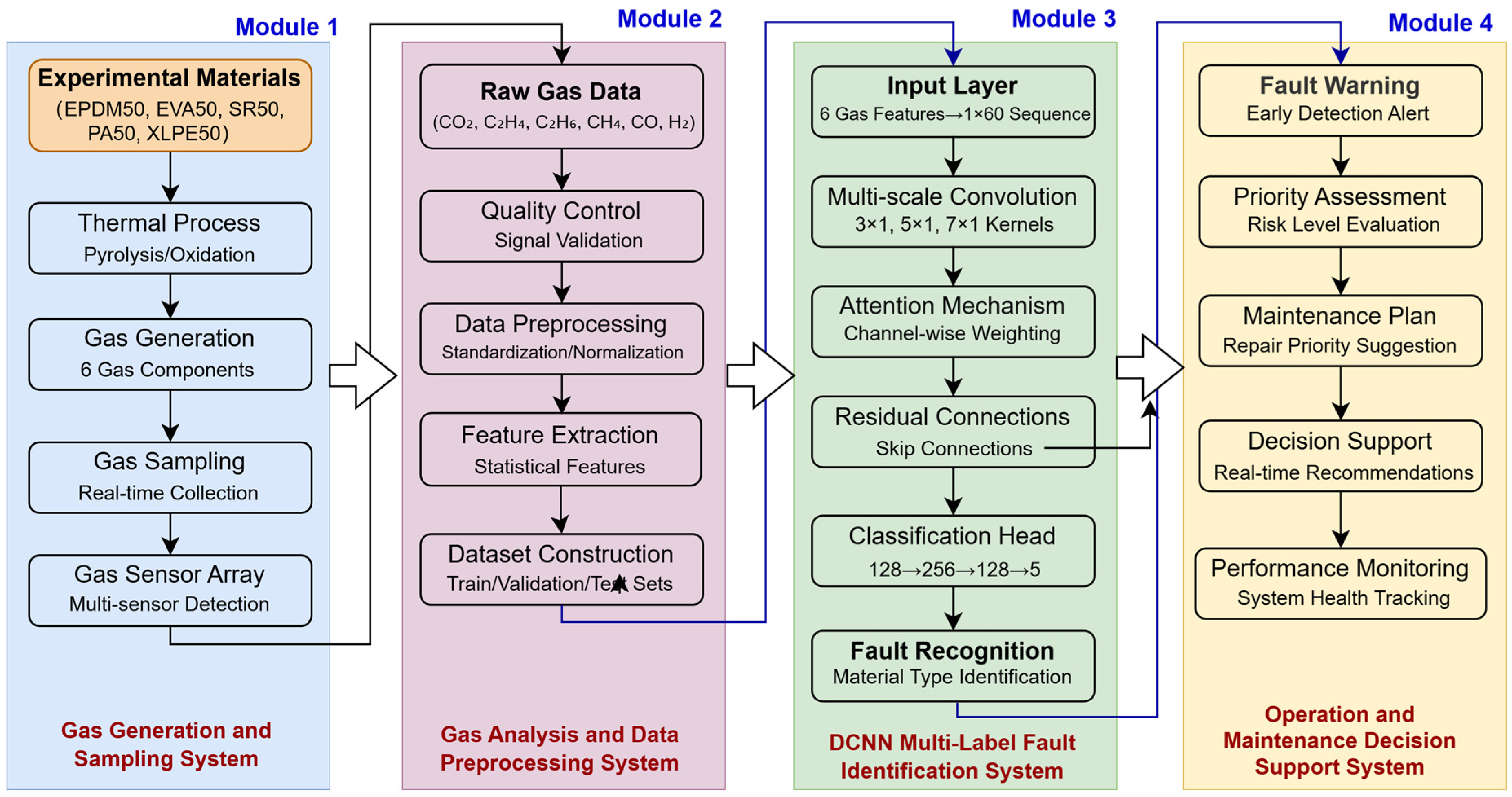 To summarize, existing gas analysis methods still face significant limitations when dealing with gas cross-interference and compound fault identification caused by the concurrent multi-mechanism aging of cable insulation materials. To address this issue, this study proposes a DCNN-based multi-label classification framework to accurately identify the gas generation characteristics of five typical insulation materials (EPDM, EVA, SR, PA, XLPE) used in power cables with voltage level between 10 kV–220 kV under complex fault conditions. The overall operational workflow of the proposed method is illustrated in