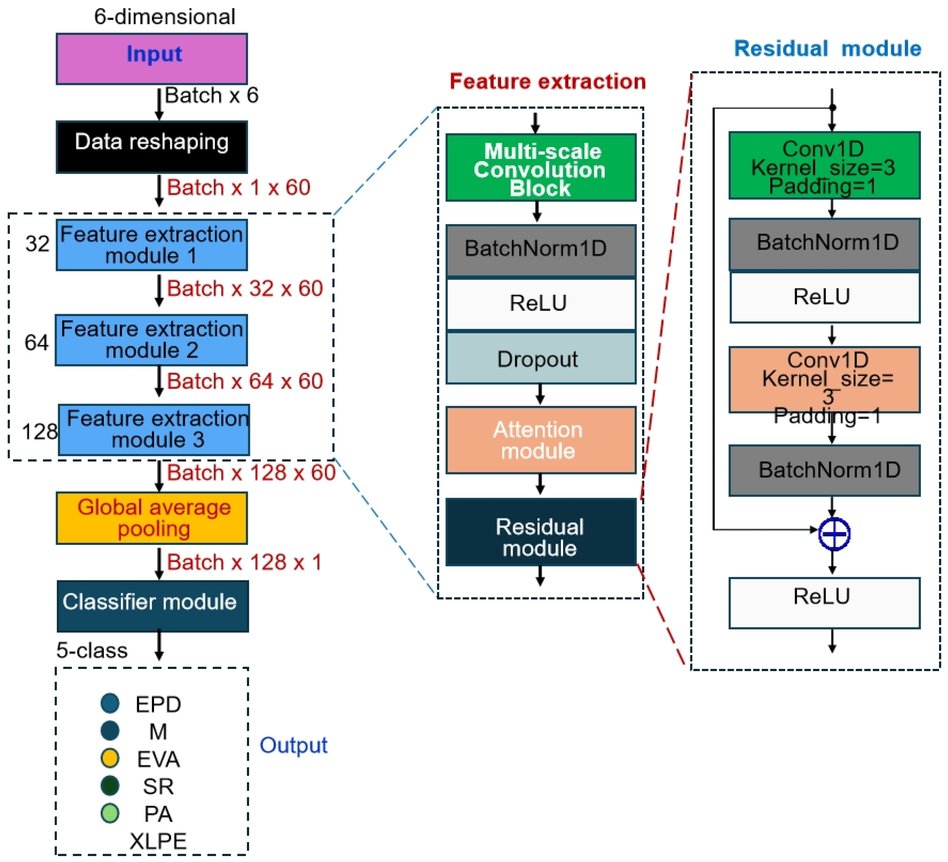 Figure 2, the network architecture follows a hierarchical learning paradigm that progresses from low-level features to high-level semantic features, comprising three cascaded feature extraction modules and one classifier module. The input data is first reshaped from a 6-dimensional gas concentration feature vector into a 1 × 60 sequential representation. It is then passed through the three feature extraction modules in sequence for multi-scale feature learning, with the number of output channels set to 32, 64, and 128, respectively, thereby enabling progressively richer and more abstract feature representations, as shown in