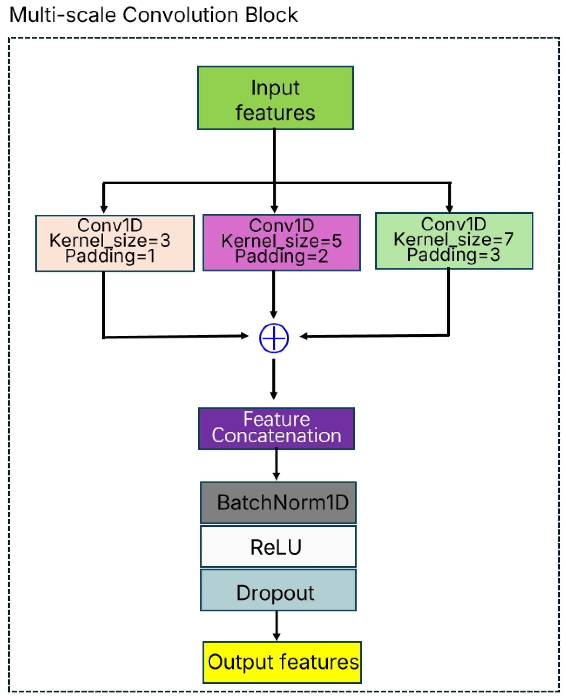 Figure 3, the Multi-Scale Convolution Block adopts a parallel-branch structure consisting of three parallel convolutional layers, which use convolution kernels of size 3 × 1, 5 × 1, and 7 × 1, respectively. This design strategy enables the model to capture local detail features (small scale), medium-range features (medium scale), and global contextual information (large scale) simultaneously. Specifically, in implementation, the input feature map is first distributed into three parallel branches: