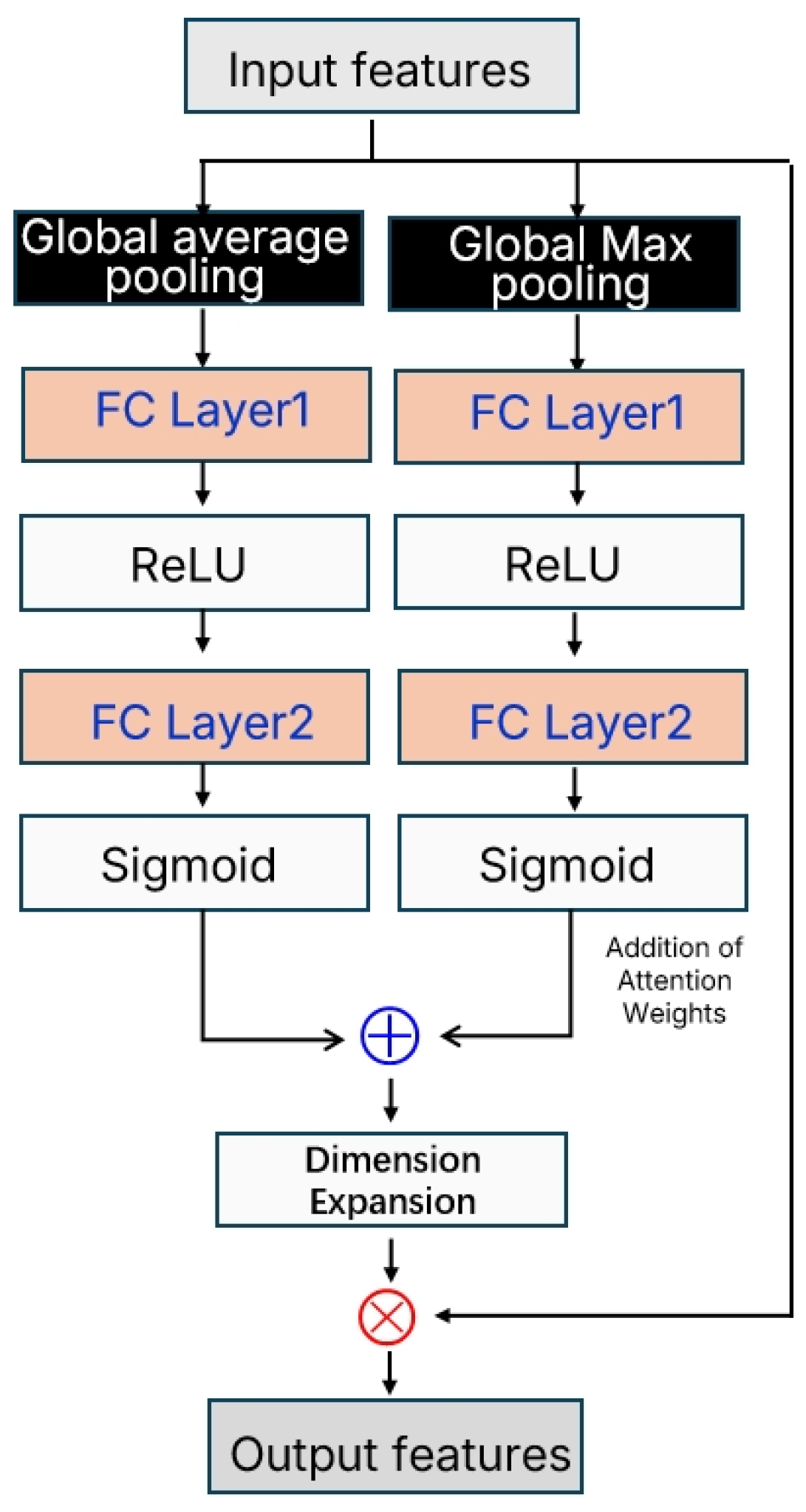 This module adopts a dual-branch architecture, in which the input feature map is processed through global average pooling and global max pooling to extract channel-wise statistical information. Global average pooling captures the overall activation level of each channel, reflecting the average importance of the features, while global max pooling focuses on peak activations, highlighting the most prominent feature responses. This dual-branch design ensures the comprehensiveness and robustness of the attention weights. Subsequently, both branches pass through fully connected layers with shared parameters for nonlinear transformation (using ReLU). In the first layer, the channel dimension is compressed to one-quarter (32 neurons) to reduce computational complexity, and in the second layer it is restored to the original channel dimension (128 neurons). The outputs are then mapped to the [0, 1] range using the Sigmoid activation function, yielding a channel attention weight vector w ∈ [0, 1]128. Finally, the attention weights from the two branches are summed and multiplied element-wise with the original features, thereby enhancing important channels and suppressing less significant ones. This design adaptively adjusts feature representations and improves the model’s sensitivity to critical features.