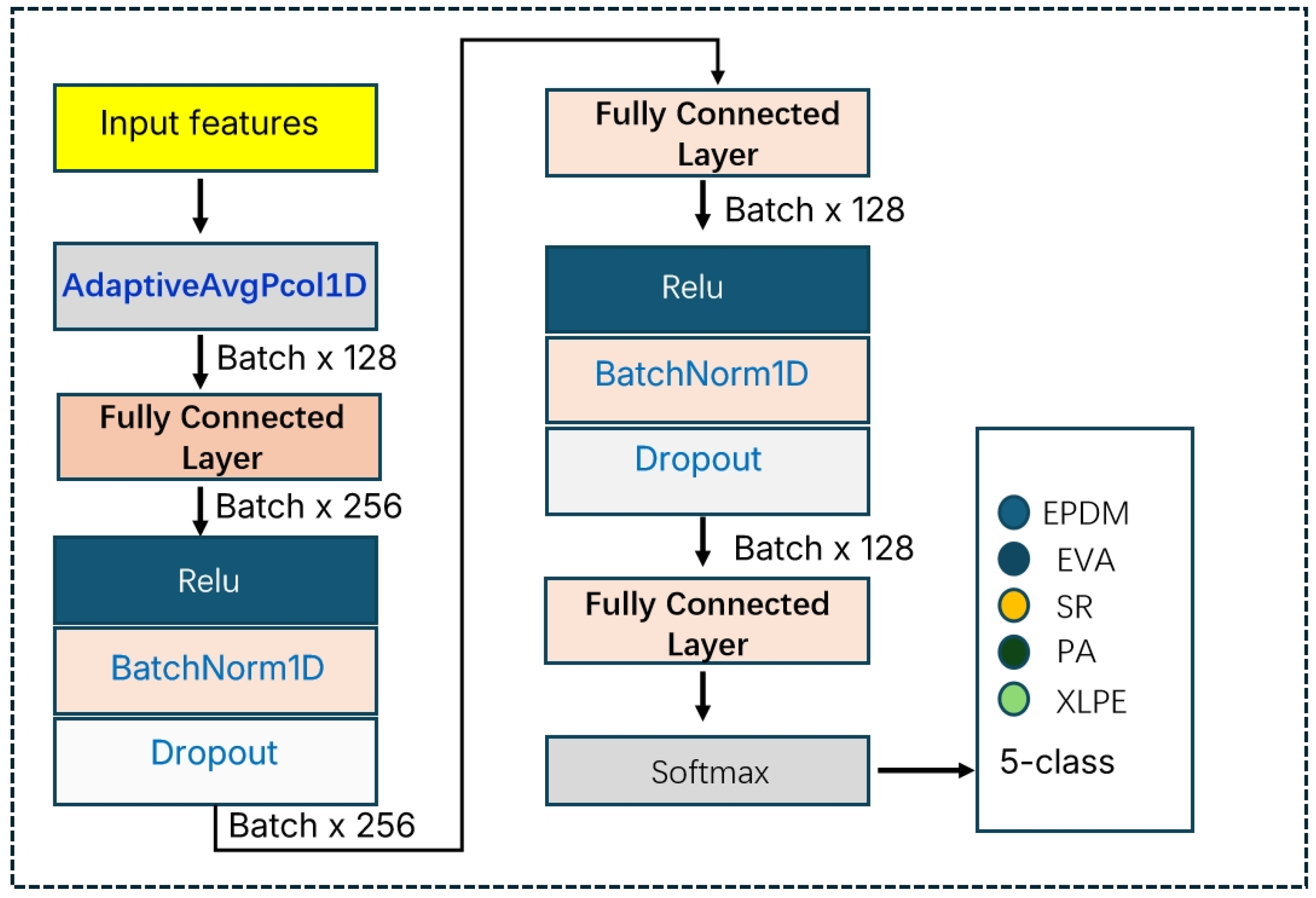 The classification layer is composed of three fully connected layers, with an output dimension of L = 5, where each neuron corresponds to one material category. The structure of the classification module is shown in