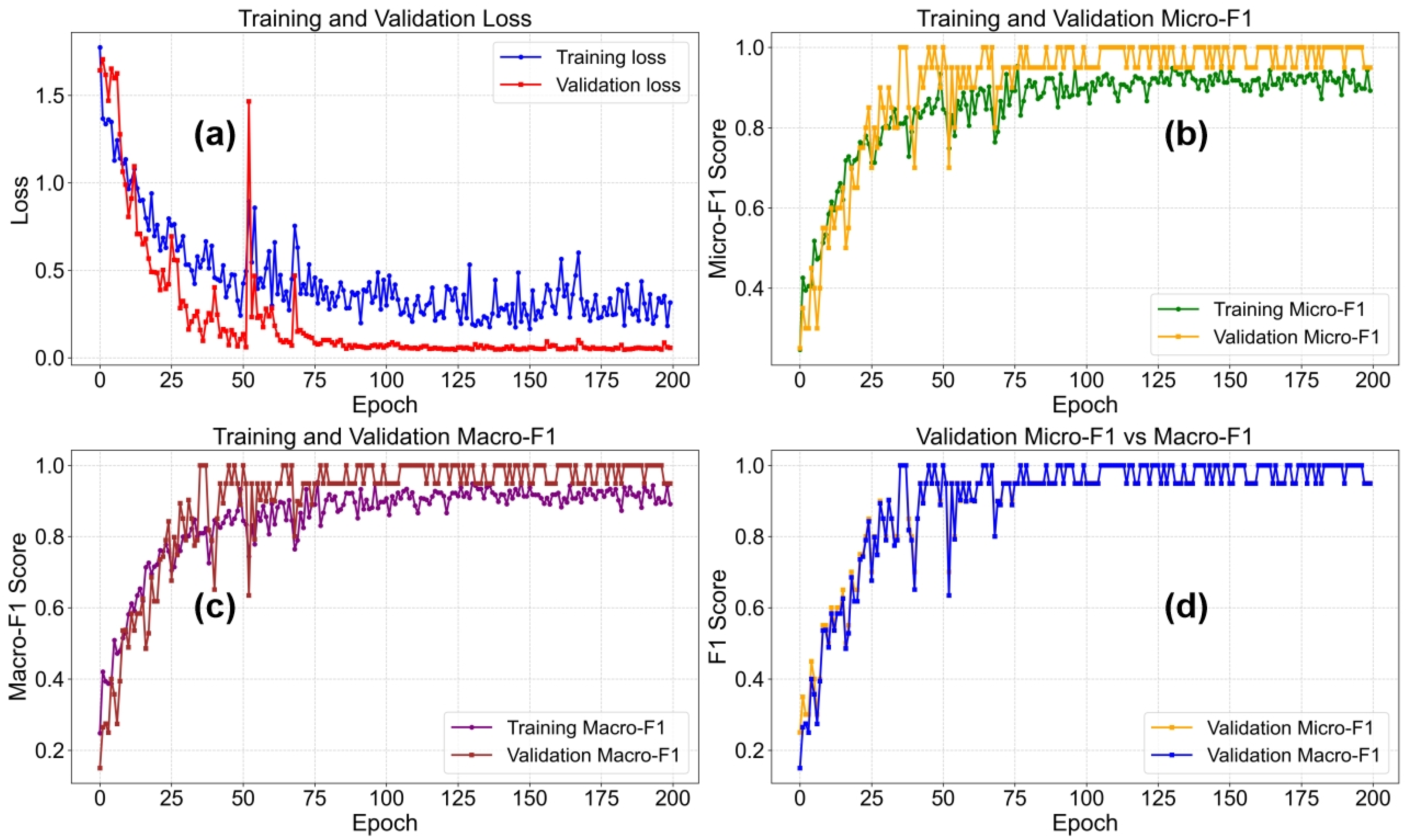 The Micro-F1 and Macro-F1 curves (b,c) track the classification performance of the model using different averaging strategies: Micro-F1 considers all categories equally by weighting them according to sample counts, while Macro-F1 provides a balanced evaluation across categories regardless of their frequency. The comparison plot (d) directly contrasts Micro-F1 and Macro-F1 scores, revealing potential effects of class imbalance. The training curves exhibit several key characteristics: rapid initial improvement followed by gradual convergence; divergence between training and validation curves indicating potential overfitting; and evidence of the effectiveness of learning rate scheduling and regularization techniques. These curves are essential for understanding the model’s learning trajectory, identifying the optimal stopping point, and evaluating the effectiveness of various training strategies and hyperparameter configurations.