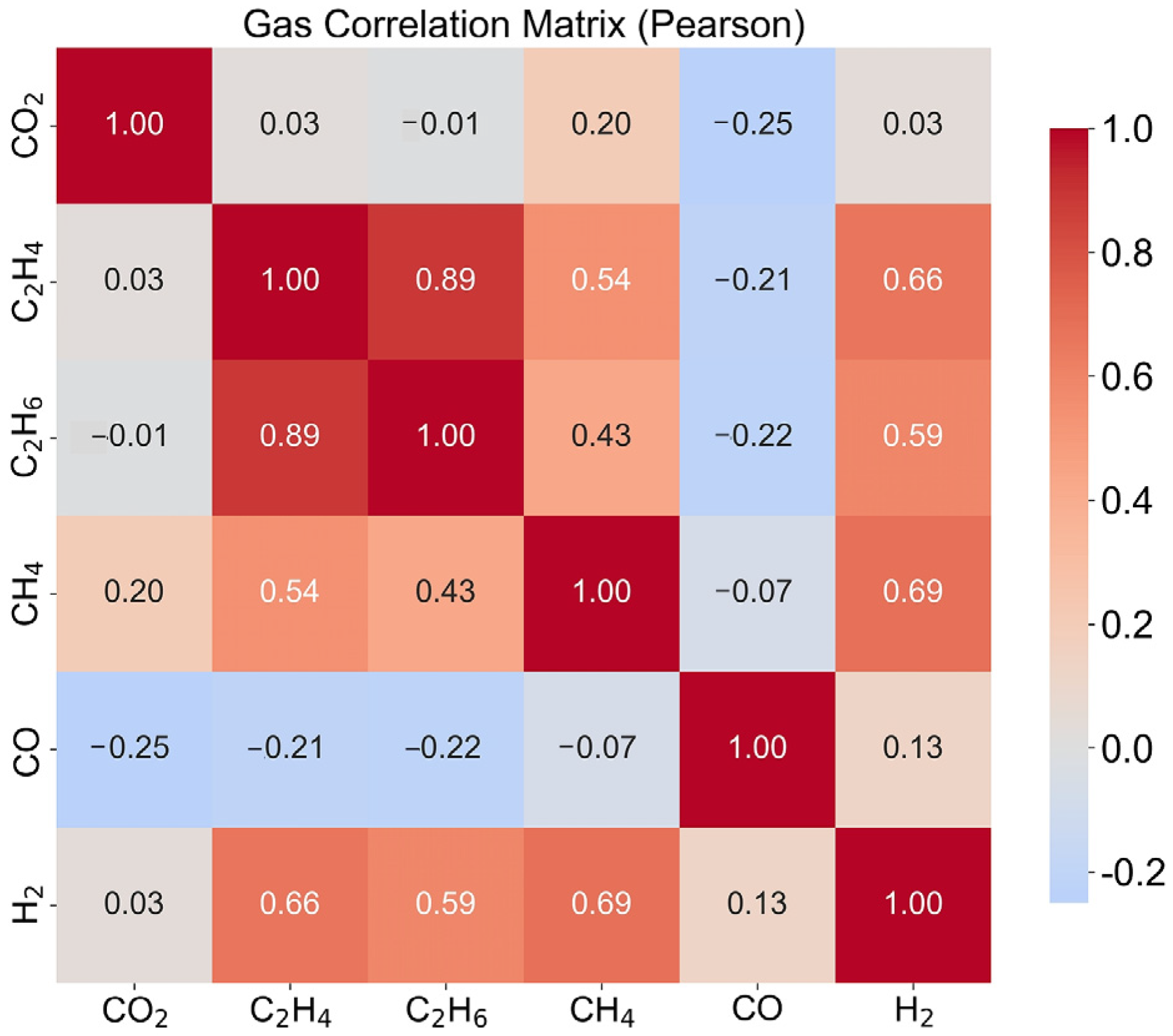 Figure 9 shows the Pearson correlation coefficient heatmap among gases, visualizing the pairwise relationships of six gas concentrations (CO