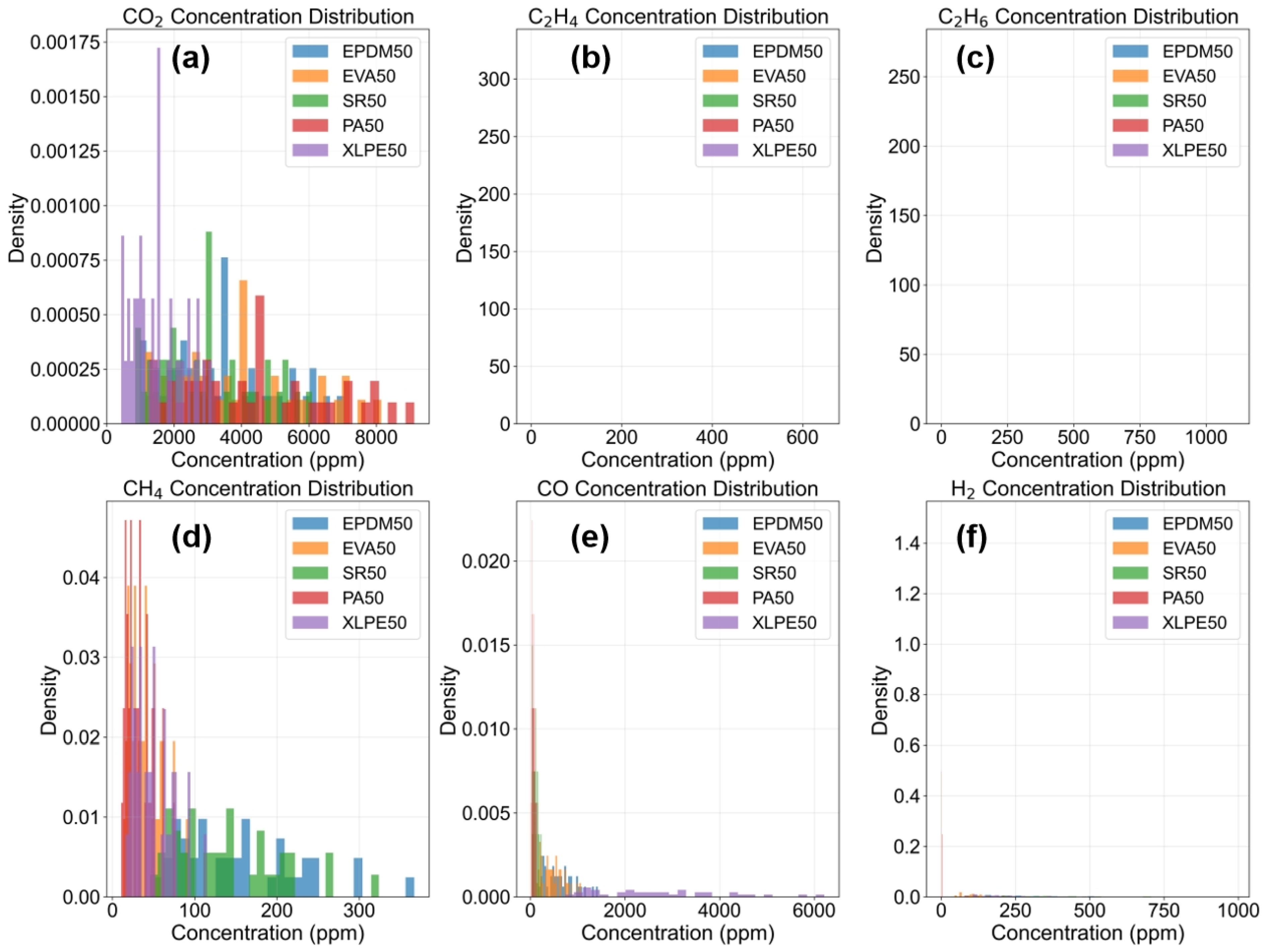 2) across different insulation material samples. The chart adopts a 2 × 3 subplot layout, with each subplot corresponding to the histogram of one gas concentration distribution. Through density normalization, the distribution differences among material types (EPDM50, EVA50, SR50, PA50, XLPE50) under the same gas concentration can be clearly observed. The distribution plots reveal significant variations in gas concentrations generated during the thermal aging of different insulation materials, reflecting differences in their thermal decomposition properties and aging mechanisms. For instance, some materials may exhibit more concentrated distributions within specific gas concentration ranges, while others display more dispersed distribution patterns. These distribution characteristics provide important feature information for material identification and classification, contributing to a better understanding of the degradation behavior of different insulation materials under thermal stress.
